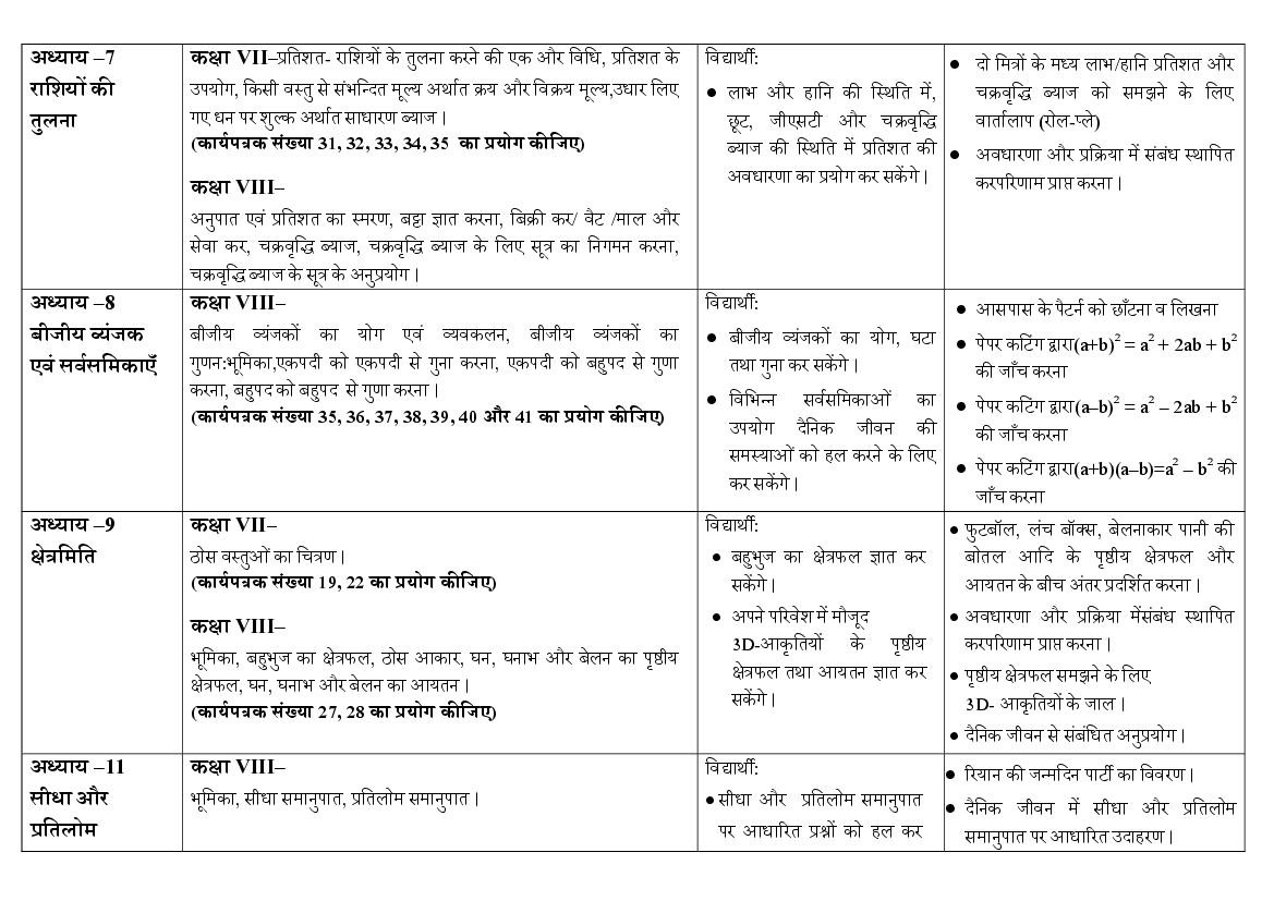 The Edudel syllabus for class 8 Maths is as follows. It has the subject name (Maths), code, contents with topic name, unit or chapter name, sub-topics, and date of completing the topic. Also whether the topic will come in Maths mid-term, or annual examination.