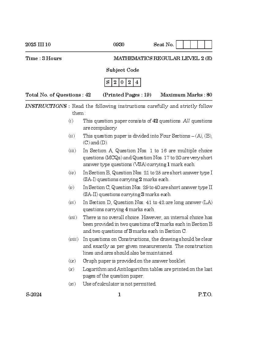 Goa Board Class 10 Question Paper 2025 Mathematics Level 2 View Download