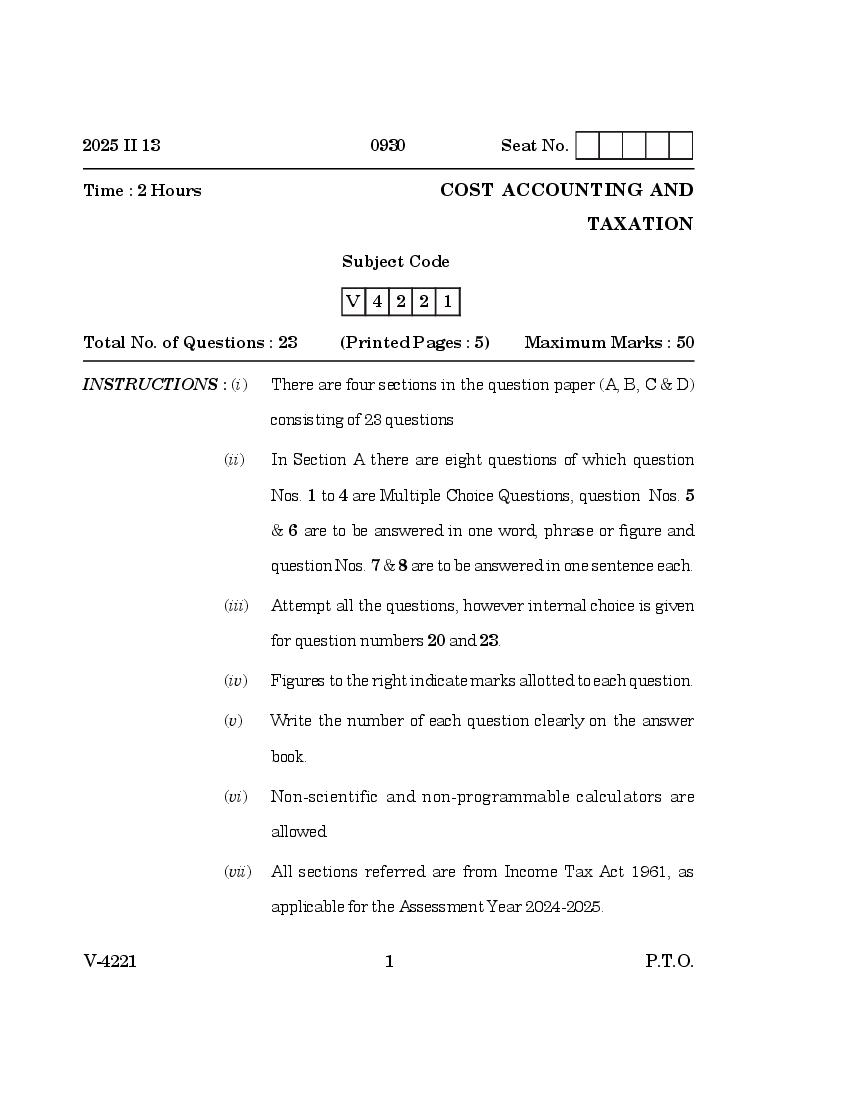 Goa Board Class 12 Question Paper 2025 Cost Accounting & Taxation View Download