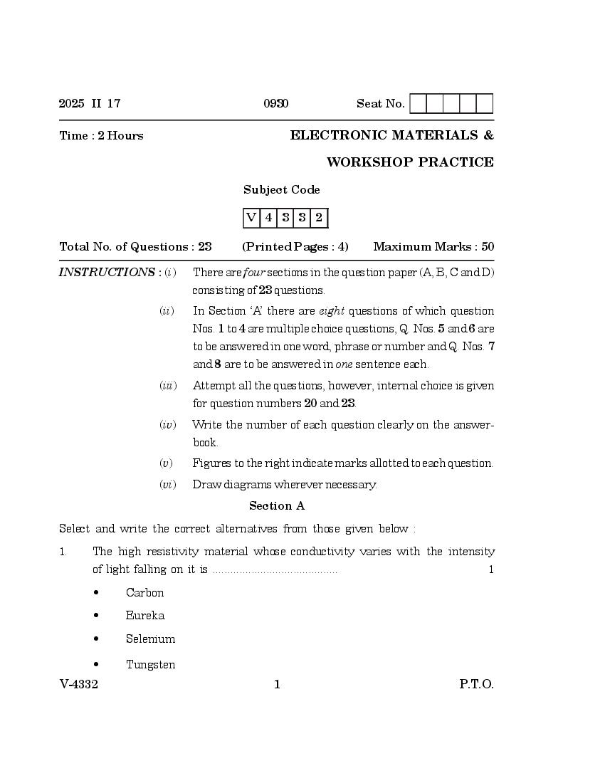 Goa Board Class 12 Question Paper 2025 for Electronic Material & Workshop Practice PDF Download – Download PDF