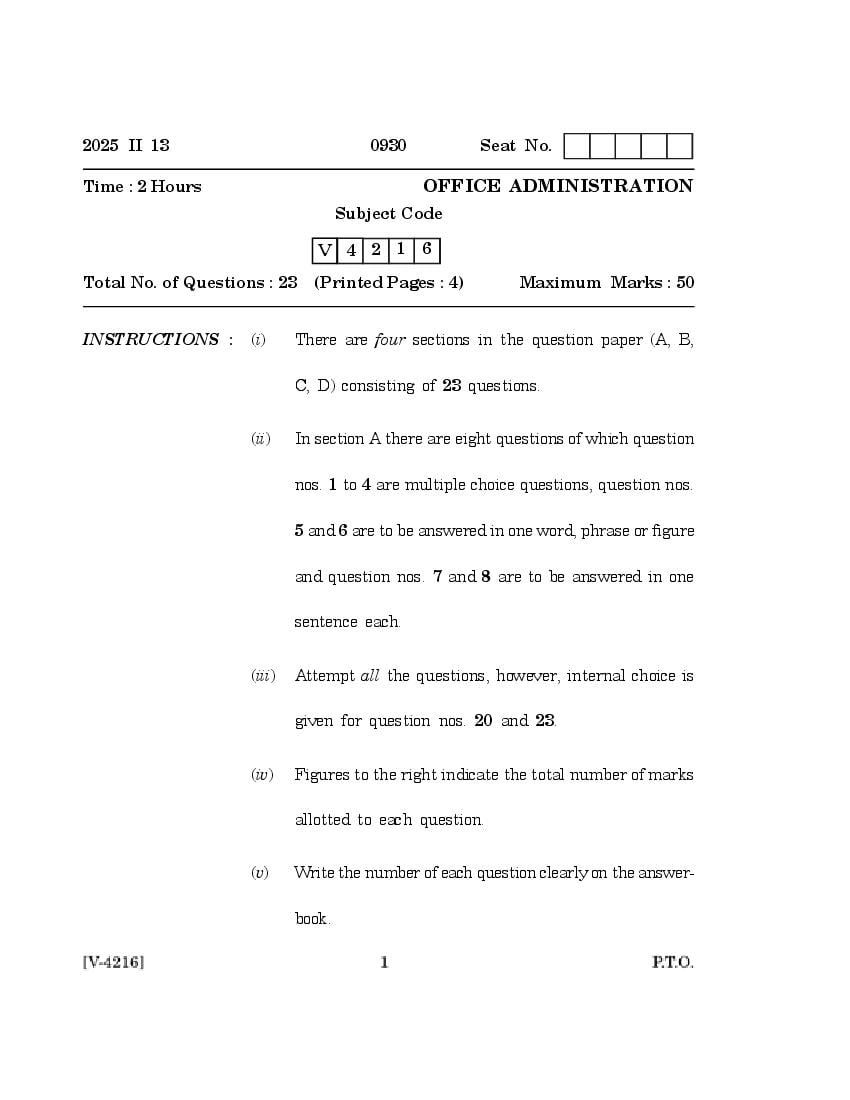 Goa Board Class 12 Question Paper 2025 Office Administration View Download