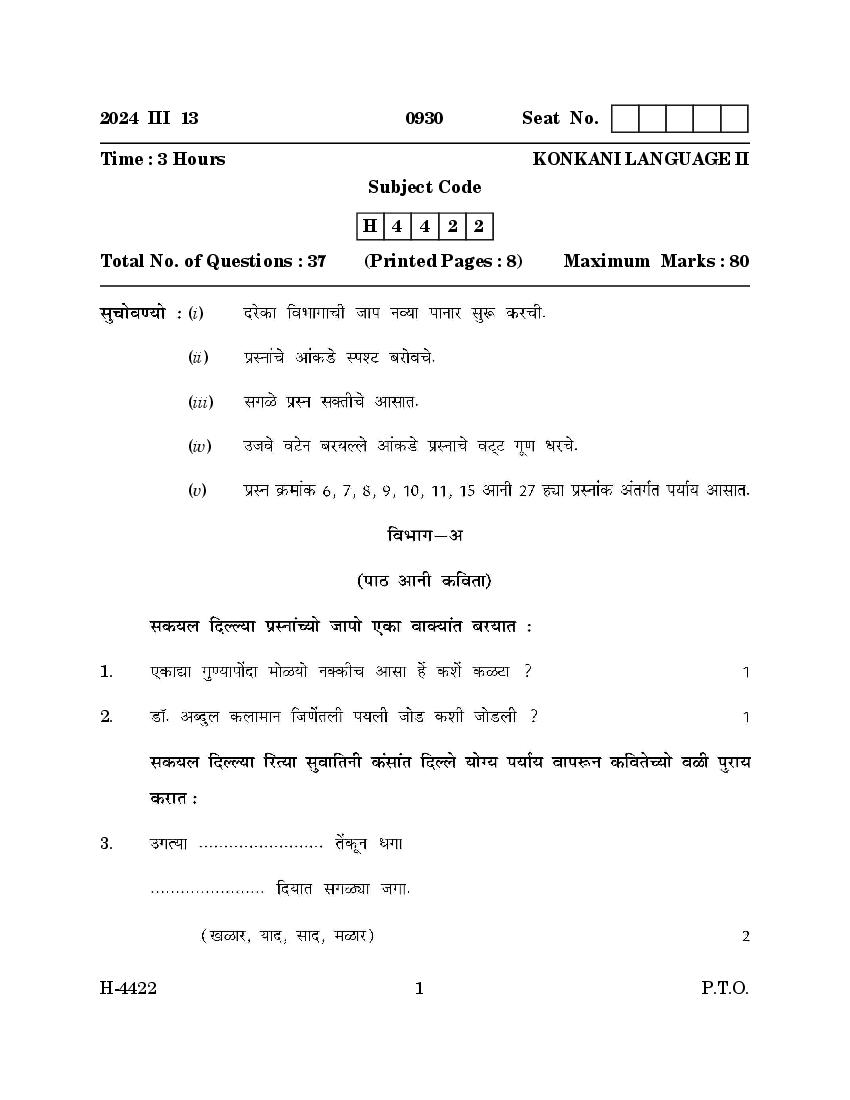 Goa Board Class 12 Question Paper 2024 for Konkani PDF Download – Download PDF