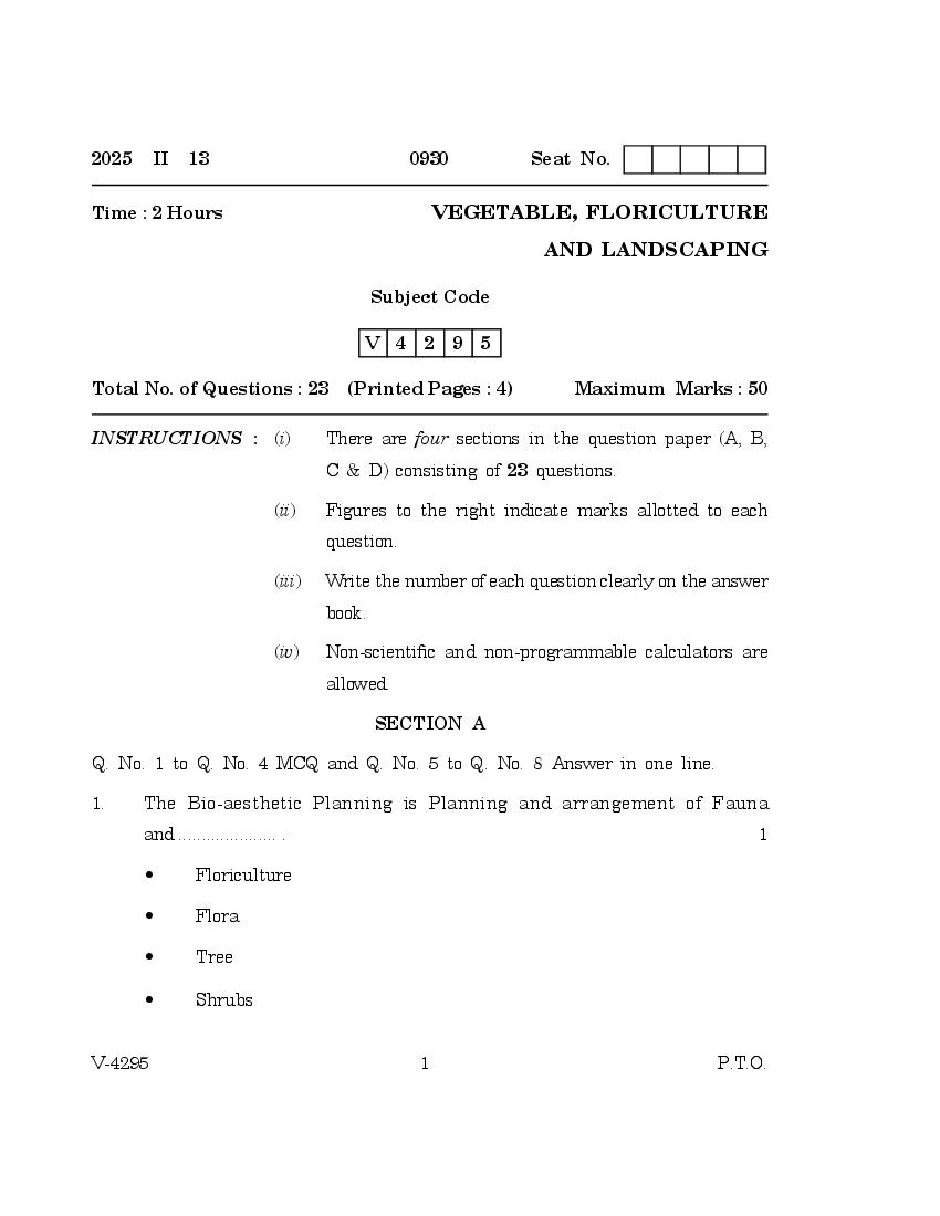 Goa Board Class 12 Question Paper 2025 for Vegetables Floriculture & Landscaping PDF Download – Download PDF