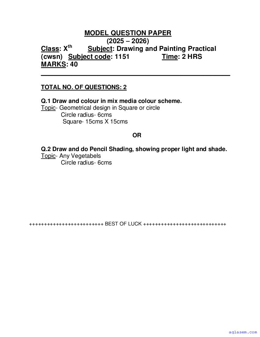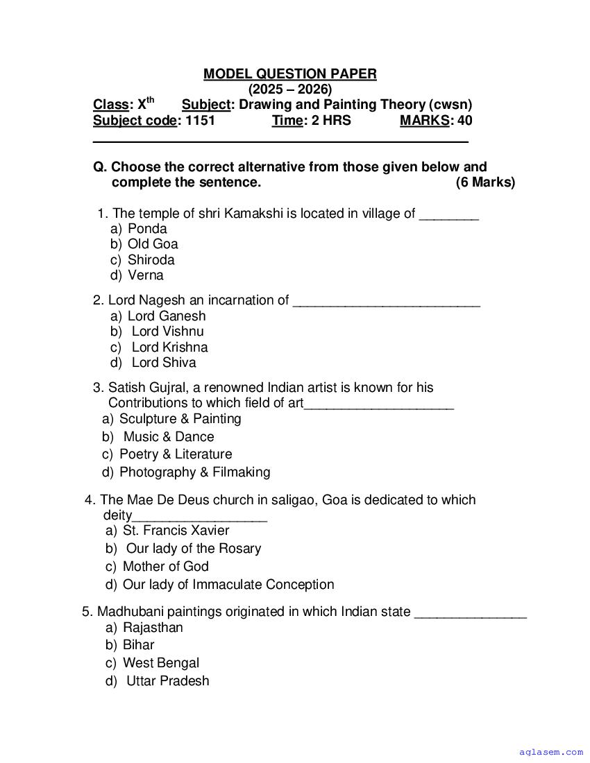 Goa Board SSC Drawing & Painting Model Question Paper 2026 is published by GBSHSE. You can download the Goa Class 10 Drawing & Painting Sample Paper PDF from here on aglasem. This Goa Board SSC Model Paper contains specimen questions from the latest Drawing & Painting syllabus in a pattern similar to what you will get in actual SSC exams. Therefore by solving the Drawing & Painting sample paper, you can boost your exam preparation and target 100% marks.