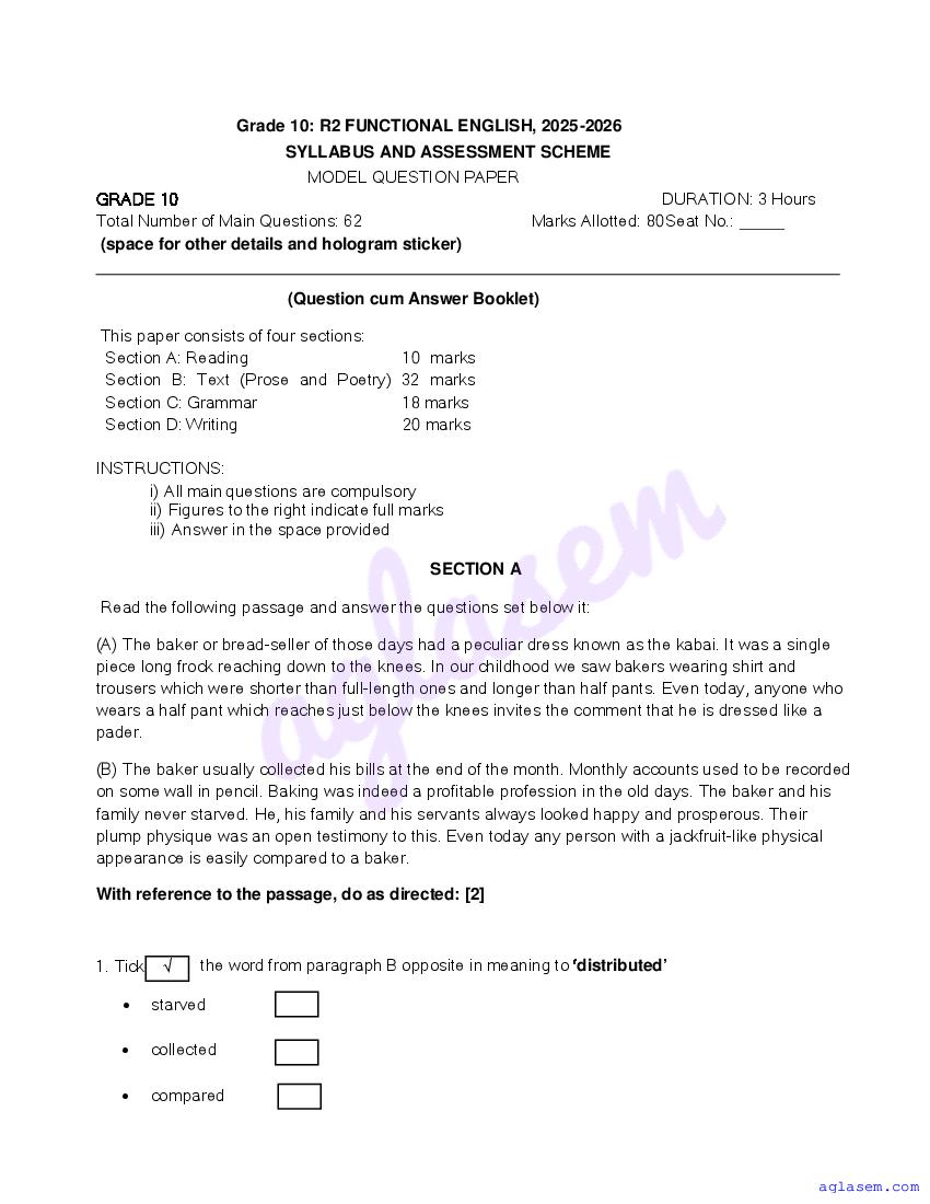 Goa Board SSC Functional English Model Question Paper 2026 is published by GBSHSE. You can download the Goa Class 10 Functional English Sample Paper PDF from here on aglasem. This Goa Board SSC Model Paper contains specimen questions from the latest Functional English syllabus in a pattern similar to what you will get in actual SSC exams. Therefore by solving the Functional English sample paper, you can boost your exam preparation and target 100% marks.