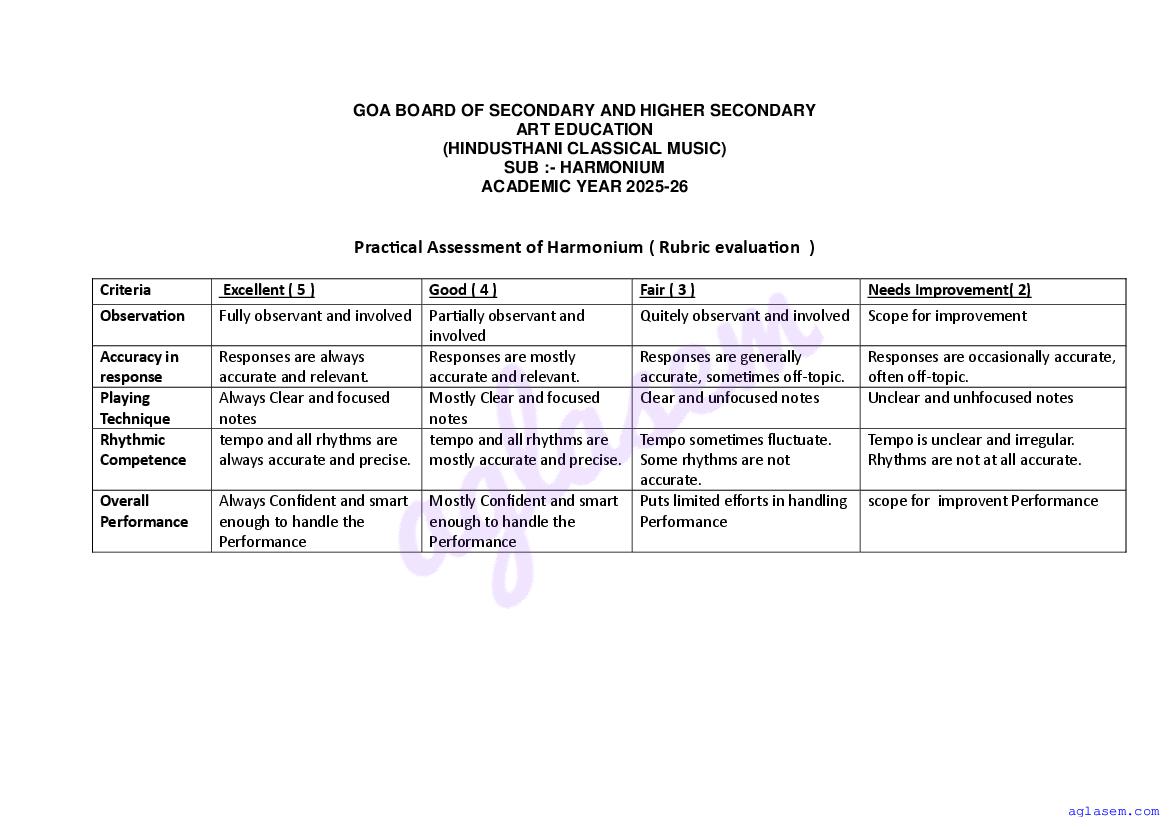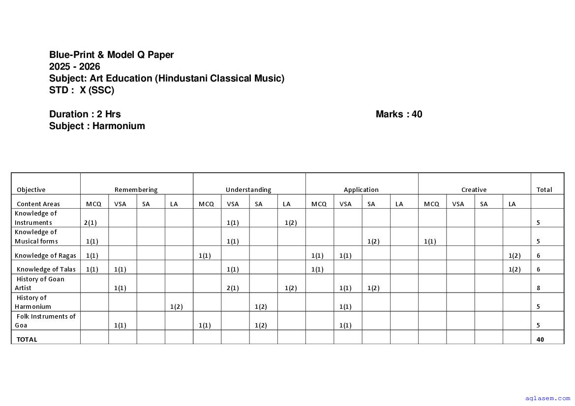 Goa Board SSC Harmonium Model Question Paper 2026 is published by GBSHSE. You can download the Goa Class 10 Harmonium Sample Paper PDF from here on aglasem. This Goa Board SSC Model Paper contains specimen questions from the latest Harmonium syllabus in a pattern similar to what you will get in actual SSC exams. Therefore by solving the Harmonium sample paper, you can boost your exam preparation and target 100% marks.