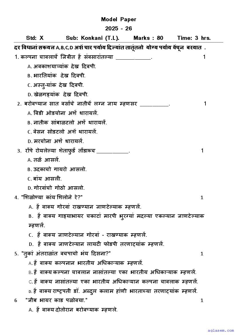 The Goa Board Model Paper for SSC (Class 10) Konkani is as follows.