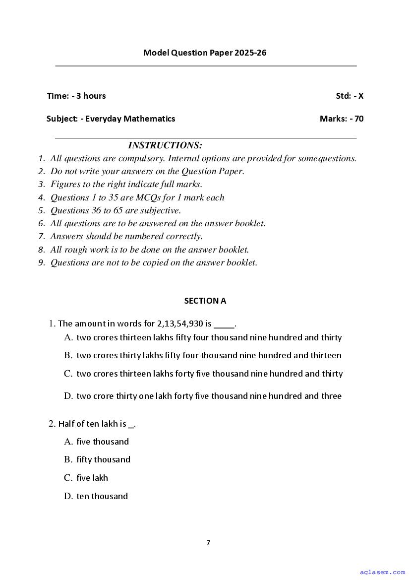 Goa Board SSC Maths Everyday Model Question Paper 2026 is published by GBSHSE. You can download the Goa Class 10 Maths Everyday Sample Paper PDF from here on aglasem. This Goa Board SSC Model Paper contains specimen questions from the latest Maths Everyday syllabus in a pattern similar to what you will get in actual SSC exams. Therefore by solving the Maths Everyday sample paper, you can boost your exam preparation and target 100% marks.