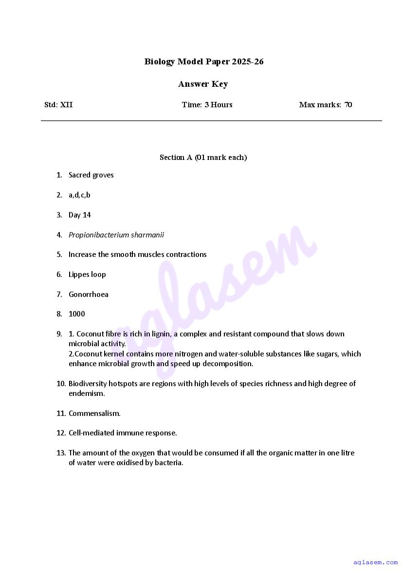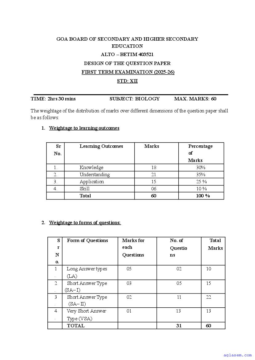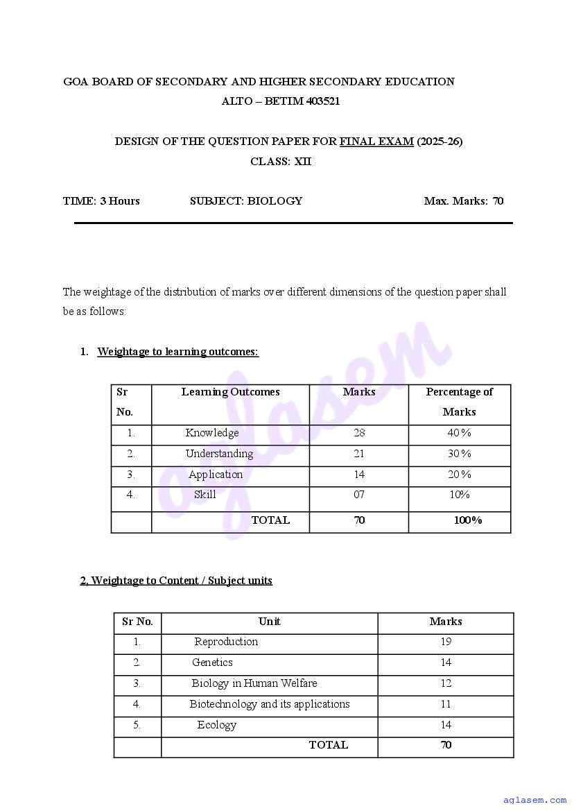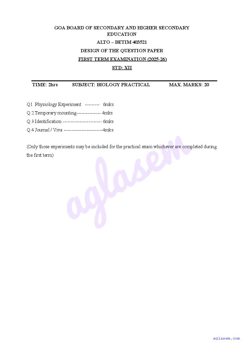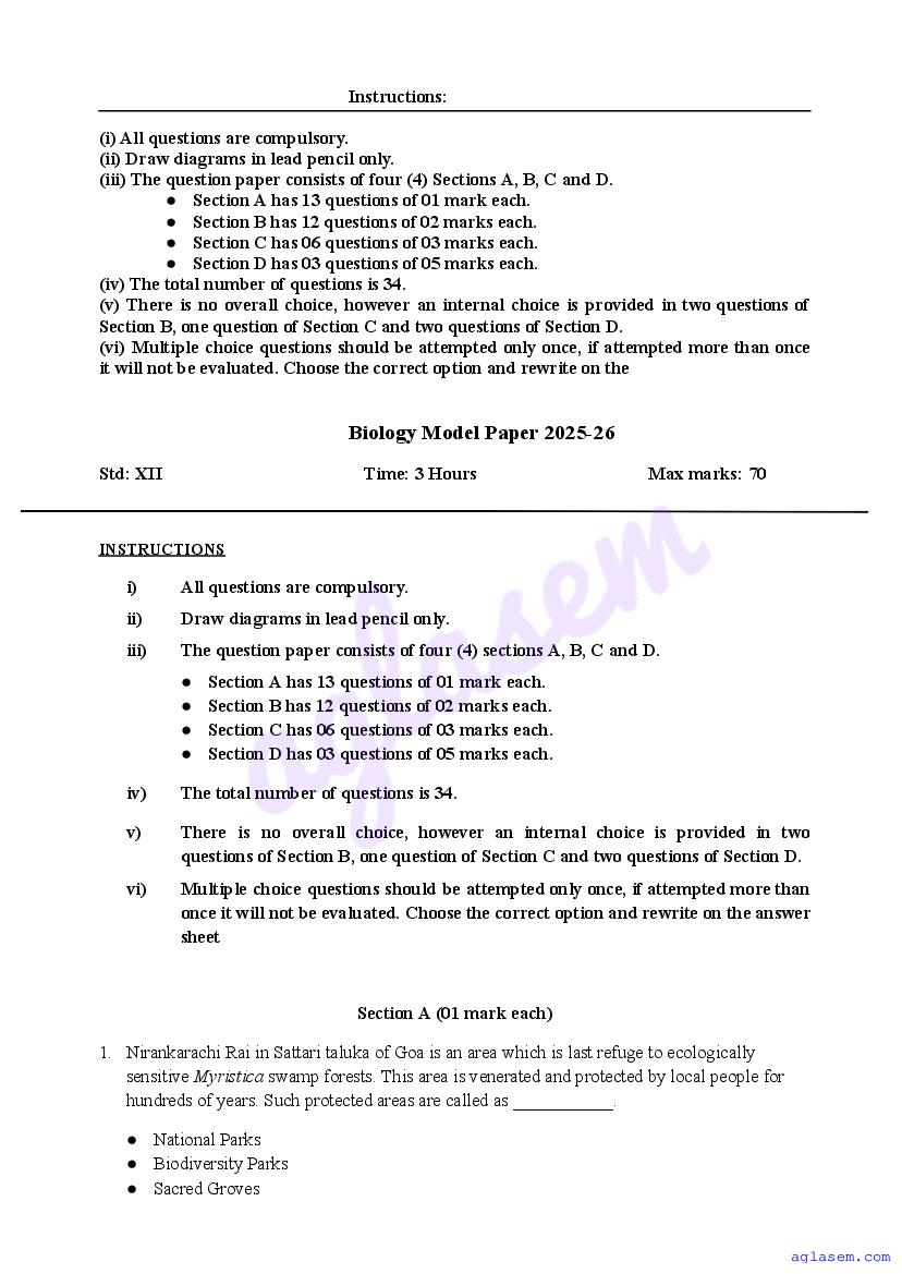 Goa Board HSSC Biology Model Question Paper 2026 is published by GBSHSE. You can download the Goa Class 12 Biology Sample Paper PDF from here on aglasem. This Goa Board HSSC Model Paper contains specimen questions from the latest Biology syllabus in a pattern similar to what you will get in actual HSSC exams. Therefore by solving the Biology sample paper, you can boost your exam preparation and target 100% marks.