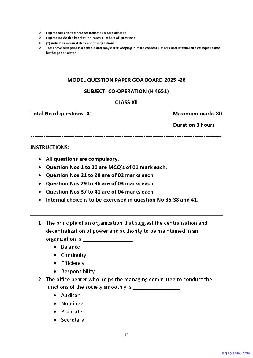 Goa Board HSSC Cooperation Model Question Paper 2026 is published by GBSHSE. You can download the Goa Class 12 Cooperation Sample Paper PDF from here on aglasem. This Goa Board HSSC Model Paper contains specimen questions from the latest Cooperation syllabus in a pattern similar to what you will get in actual HSSC exams. Therefore by solving the Cooperation sample paper, you can boost your exam preparation and target 100% marks.