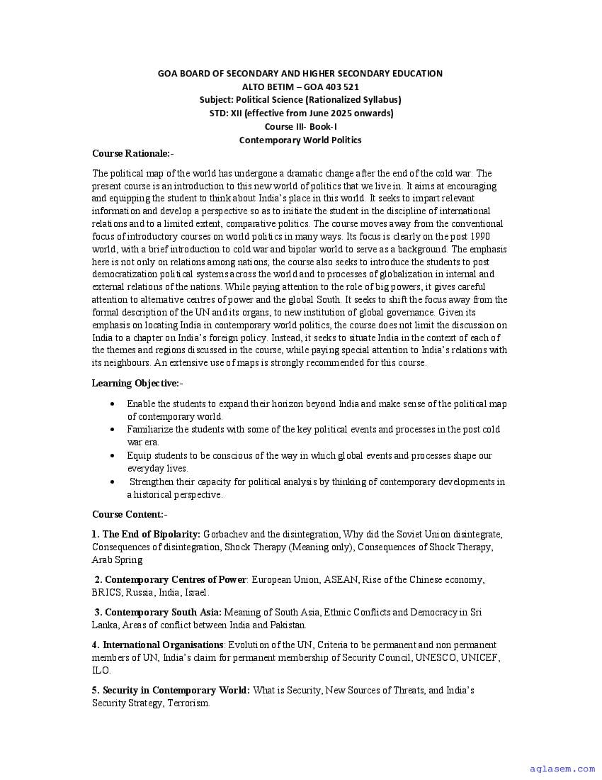 - Goa Board Class 12th Political Science Syllabus – You should refer the Goa HSSC Syllabus for Political Science as prescribed by the Goa Board of Secondary and Higher Secondary Education.