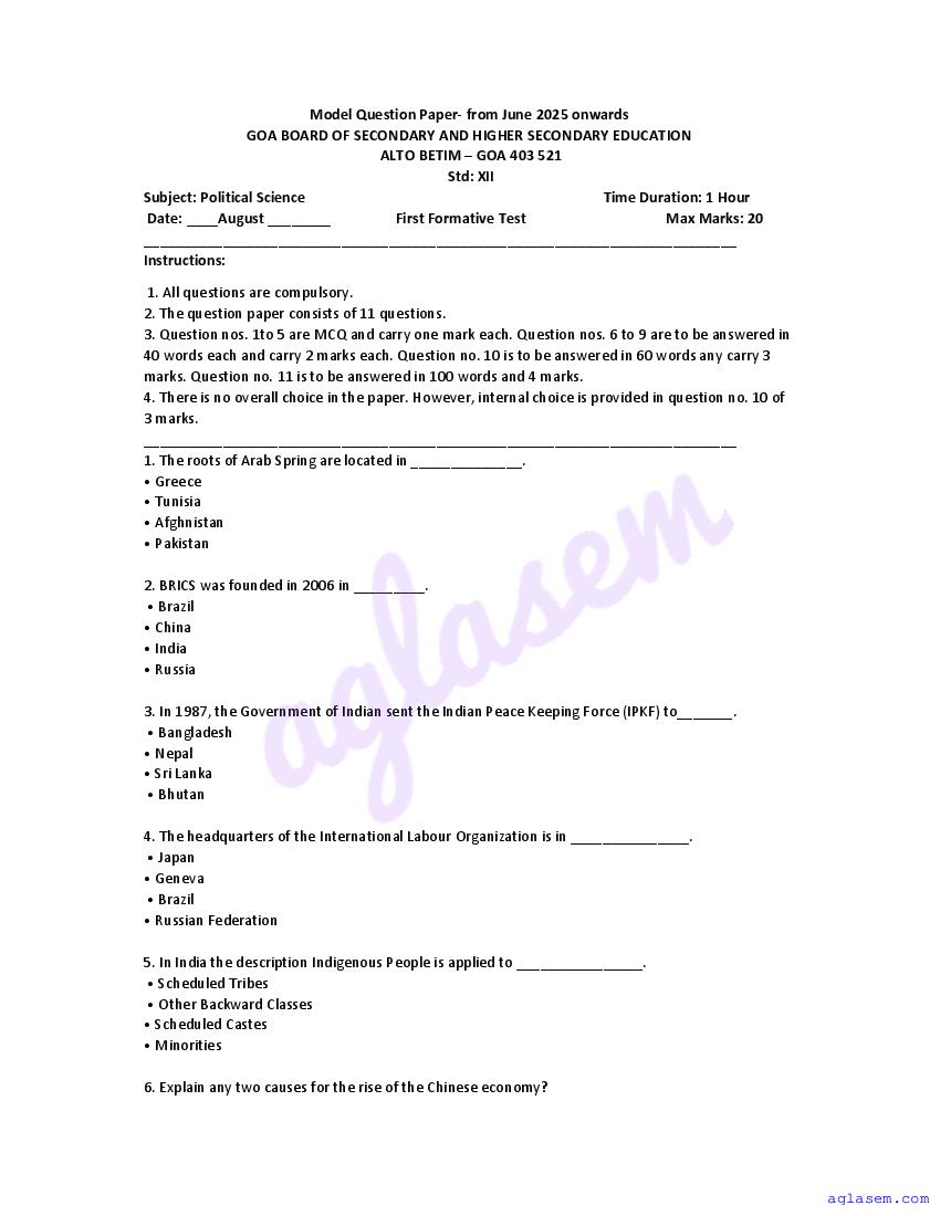 Goa Board HSSC Political Science Model Question Paper 2026 is published by GBSHSE. You can download the Goa Class 12 Political Science Sample Paper PDF from here on aglasem. This Goa Board HSSC Model Paper contains specimen questions from the latest Political Science syllabus in a pattern similar to what you will get in actual HSSC exams. Therefore by solving the Political Science sample paper, you can boost your exam preparation and target 100% marks.