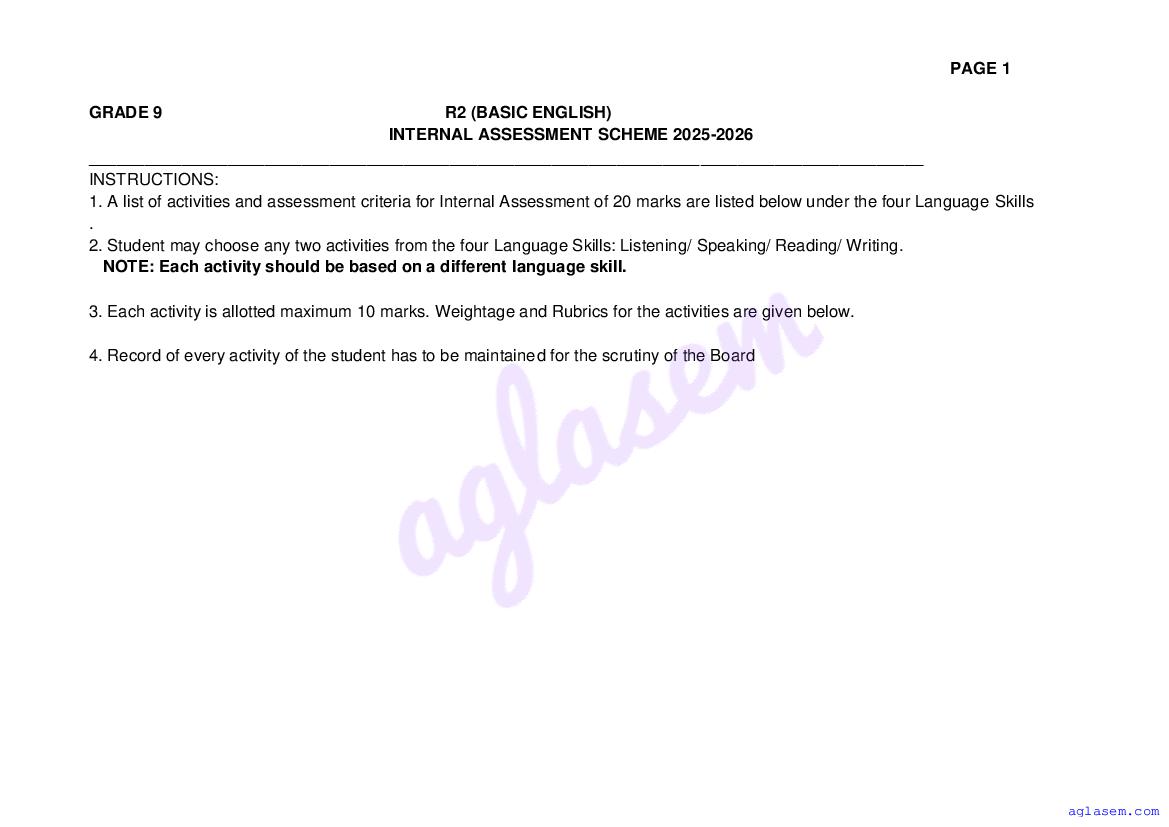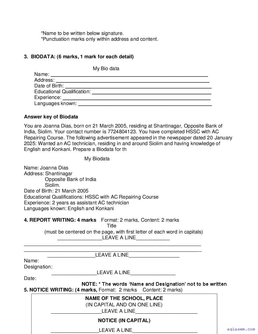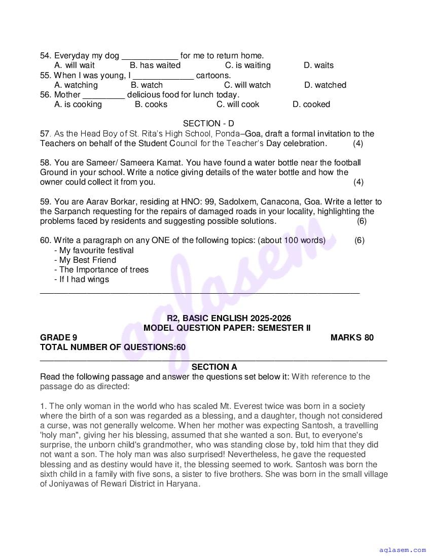 Goa Board Class 9 English Basic Model Question Paper 2026 is published by GBSHSE. You can download the Goa Class 9 English Basic Sample Paper PDF from here on aglasem. This Goa Board Class 9 Model Paper contains specimen questions from the latest English Basic syllabus in a pattern similar to what you will get in actual Class 9 exams. Therefore by solving the English Basic sample paper, you can boost your exam preparation and target 100% marks.