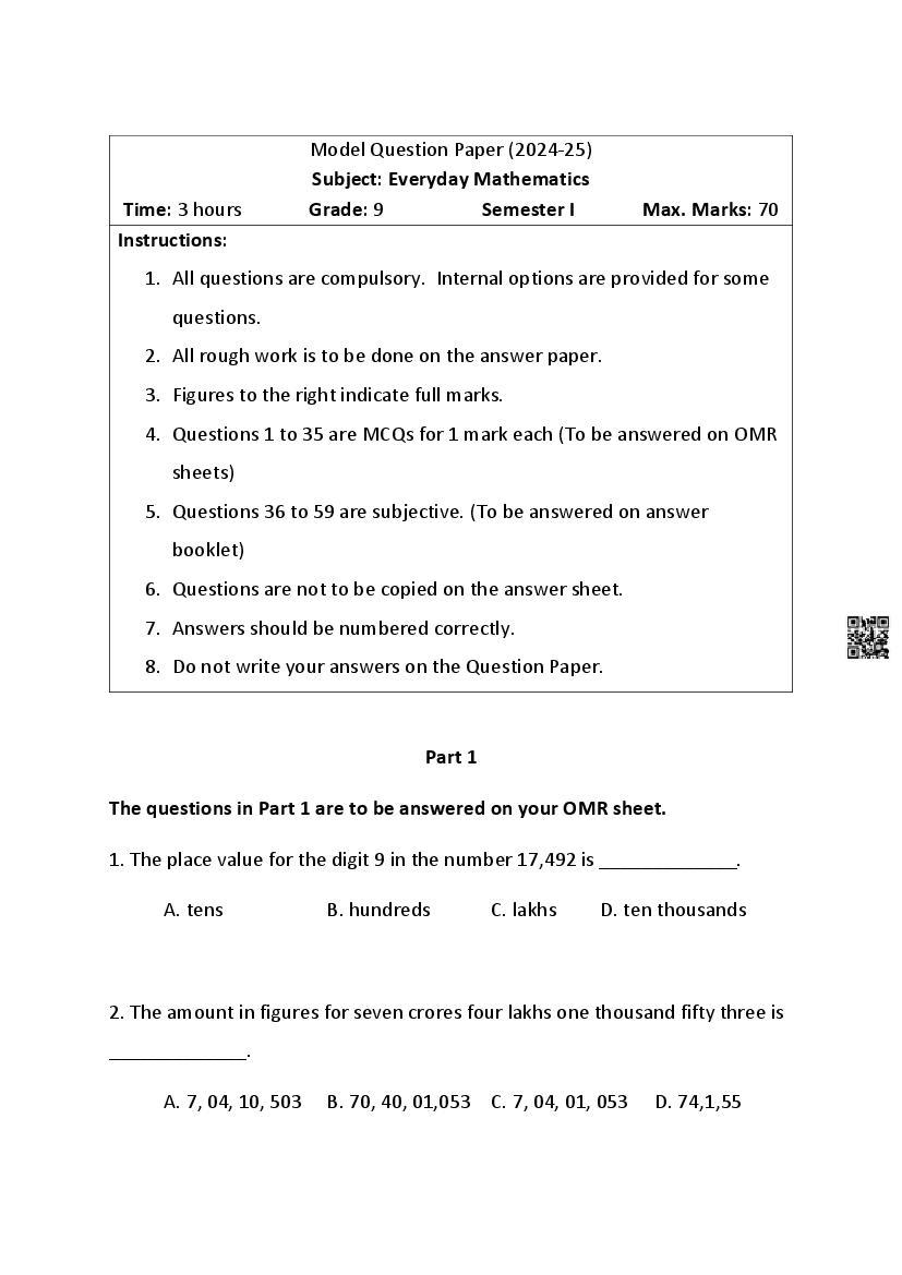 The Goa Board Model Paper for Class 9 (Class 9) Maths Everyday is as follows.