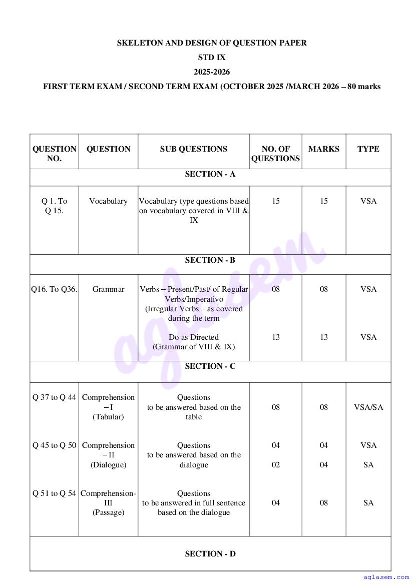 Goa Board Class 9 Portuguese Model Question Paper 2026 is published by GBSHSE. You can download the Goa Class 9 Portuguese Sample Paper PDF from here on aglasem. This Goa Board Class 9 Model Paper contains specimen questions from the latest Portuguese syllabus in a pattern similar to what you will get in actual Class 9 exams. Therefore by solving the Portuguese sample paper, you can boost your exam preparation and target 100% marks.