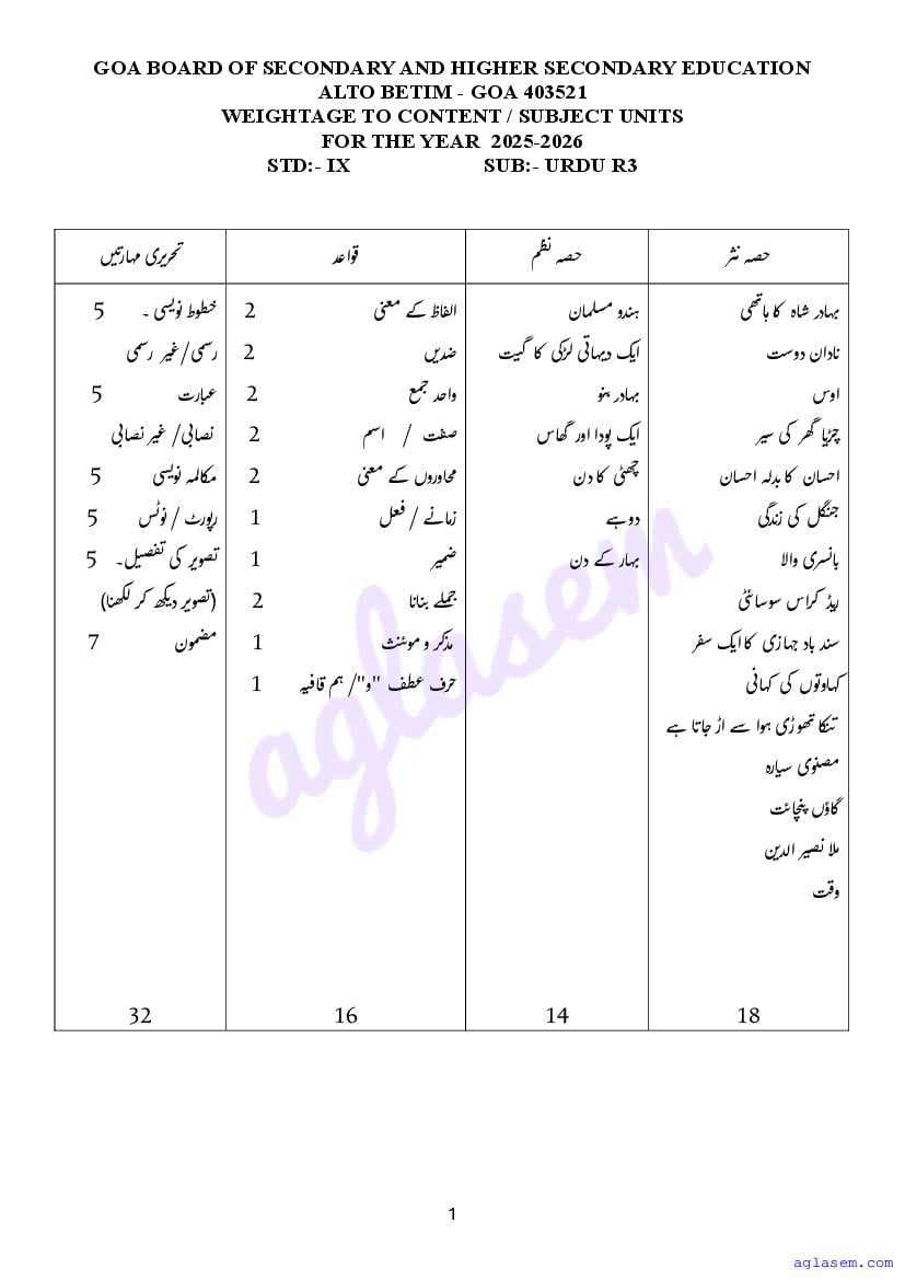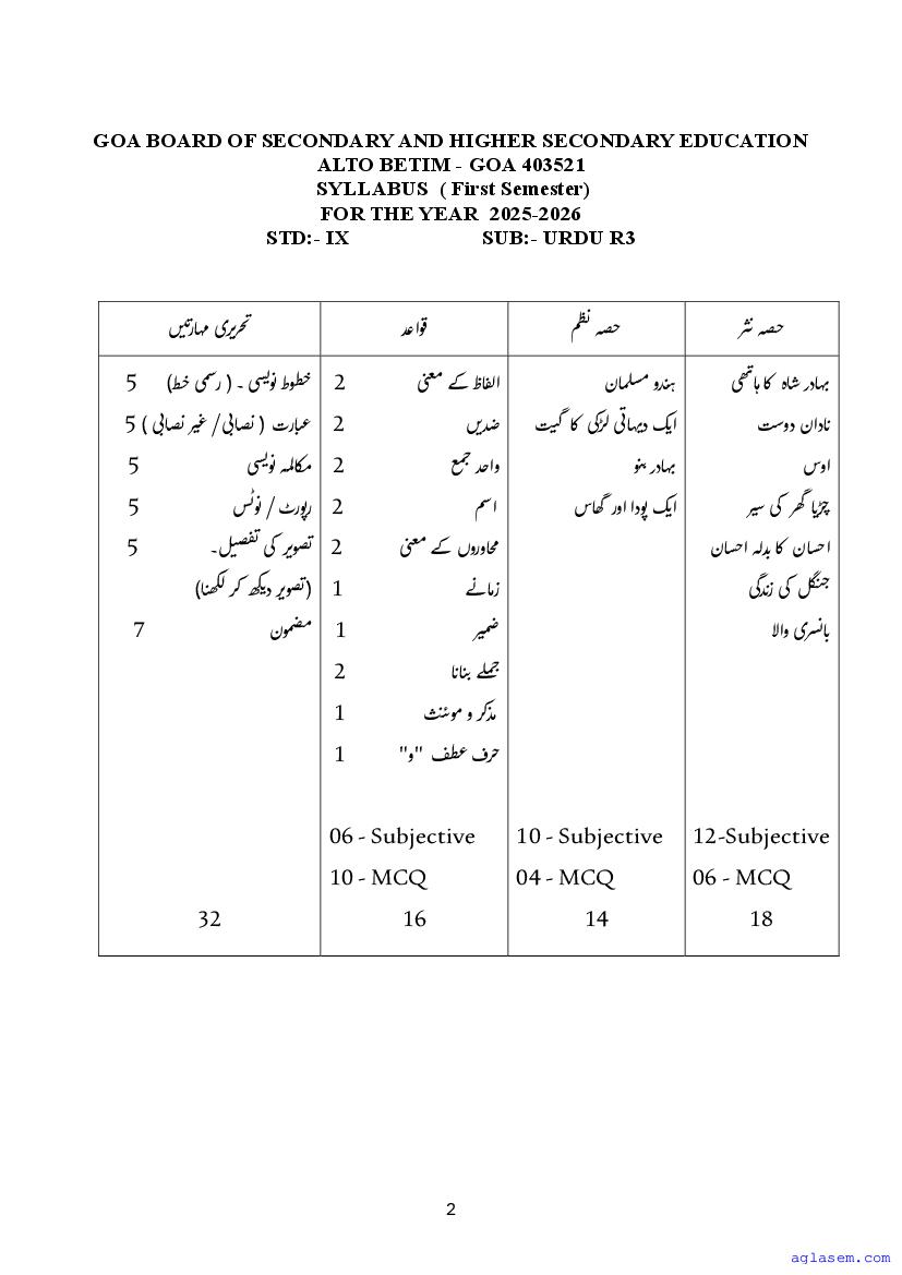 • Goa Board Class 9th Urdu Syllabus – You should refer the Goa Class 9 Syllabus for Urdu as prescribed by the Goa Board of Secondary and Higher Secondary Education.