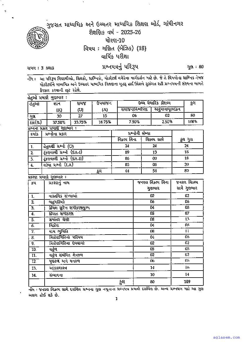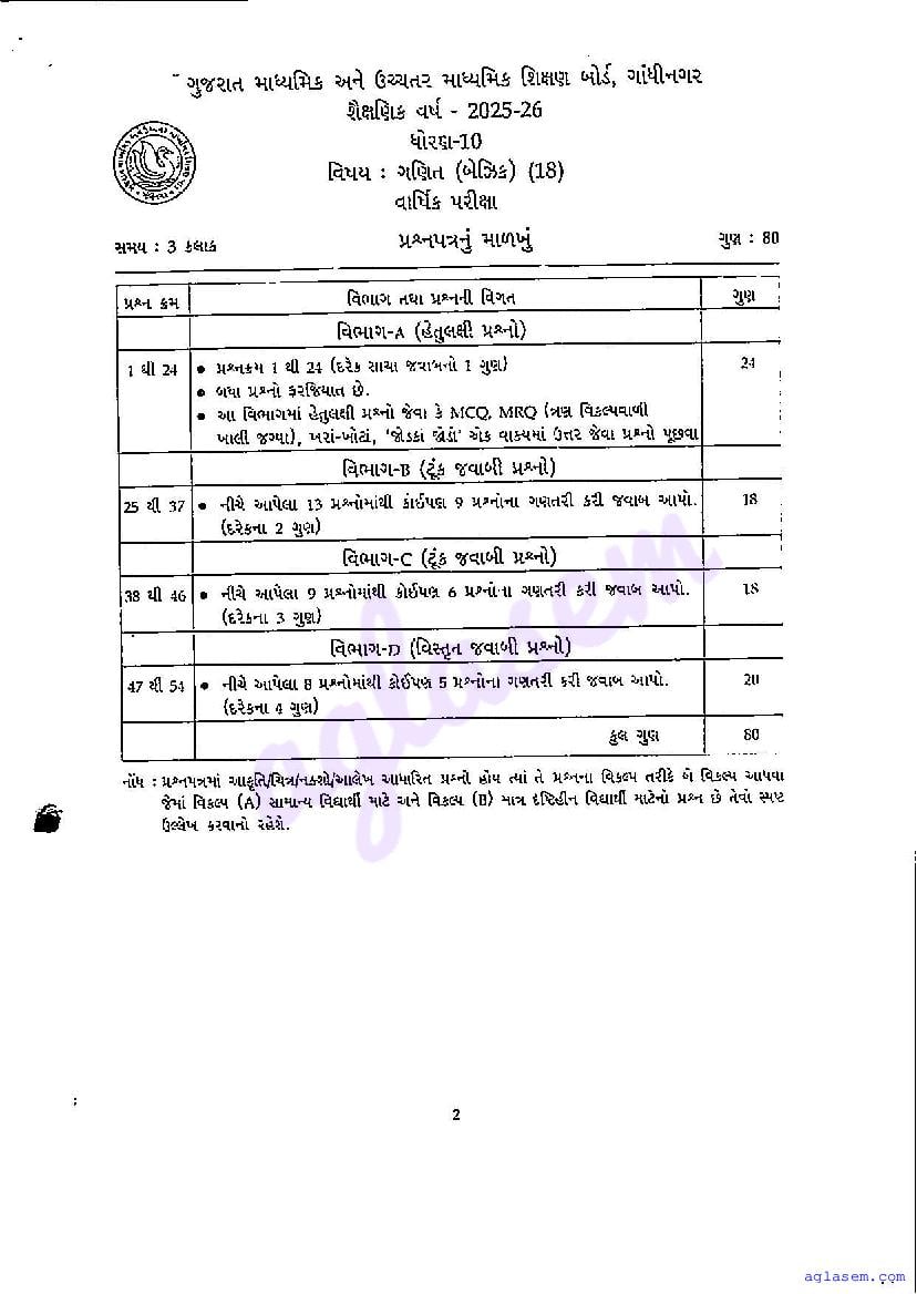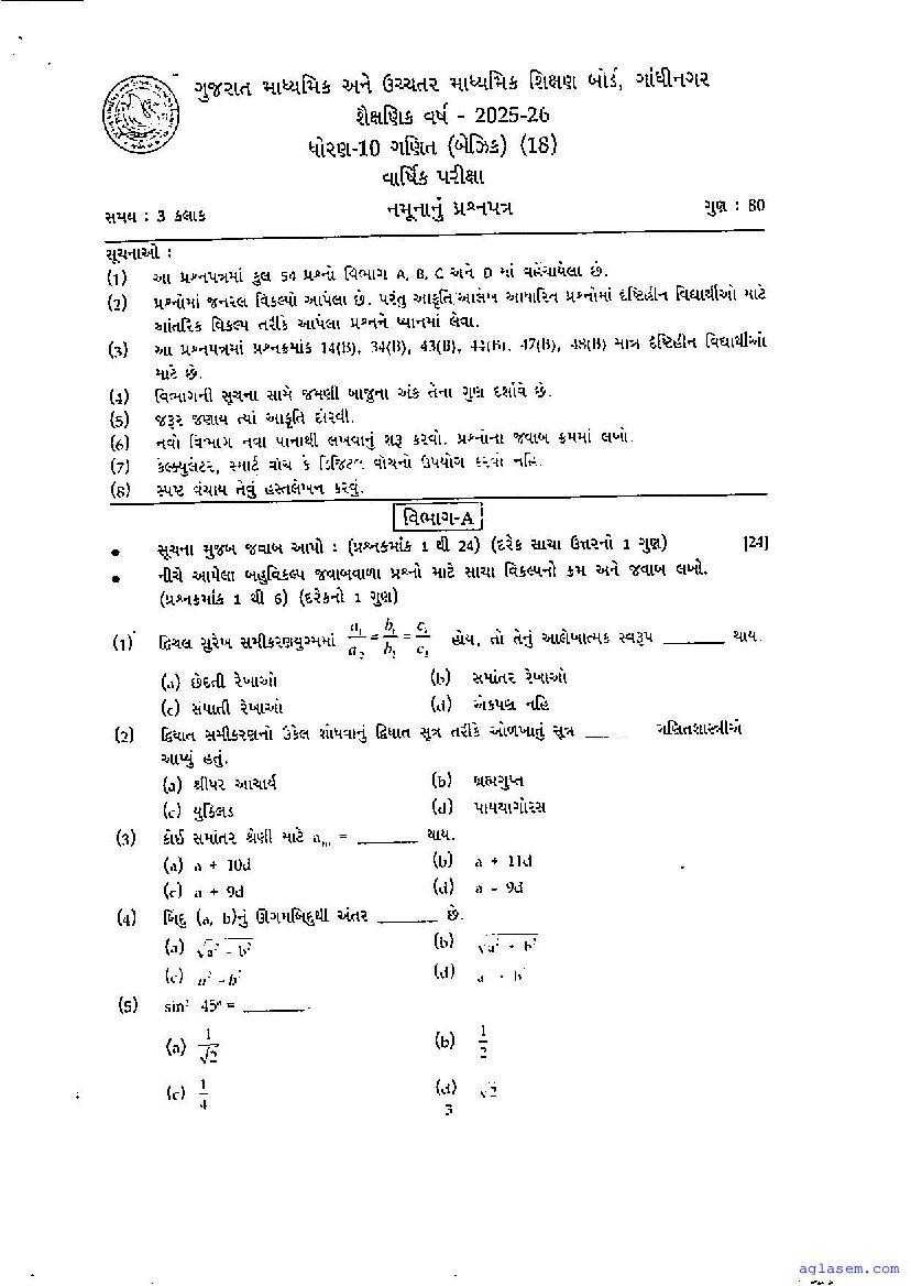 GSEB Std 10th Maths Model Paper 2026 has been released by Gujarat Board. You can download the Gujarat Board Class 10 Maths Sample Paper PDF from this page on Aglasem for study purposes. This GSEB Std 10th Model Paper is for the Maths Basic subject to help you prepare for the Class 10 exams. The Maths Basic sample paper includes illustrative questions based on the latest Gujarat Board syllabus for Standard 10, thereby helping you prepare for the Maths Basic paper. By practicing with the Std 10 Maths Basic sample paper, you can aim for high marks in the GSEB exams.