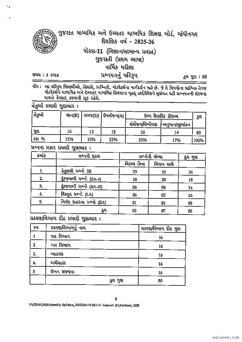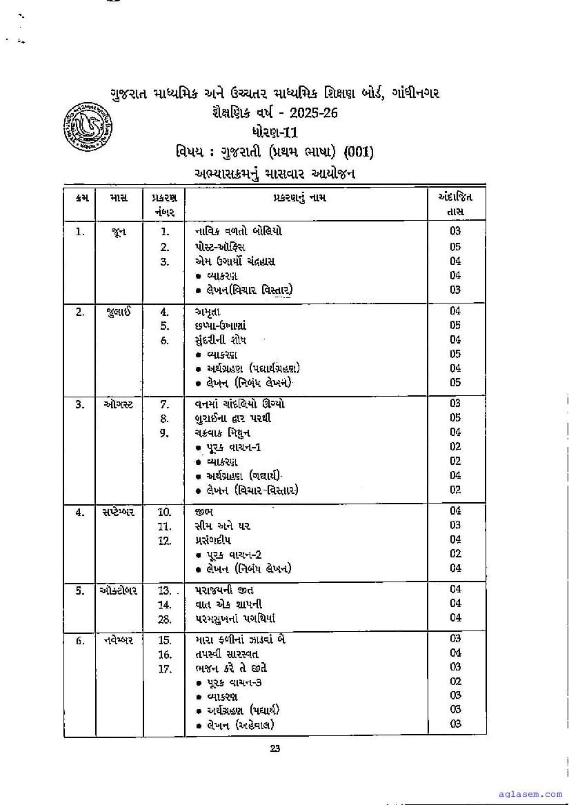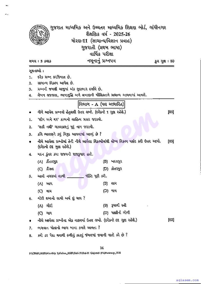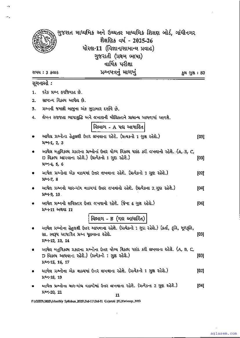 GSEB Std 11th Gujarati FL Model Paper 2026 has been released by Gujarat Board. You can download the Gujarat Board Class 11 Gujarati First Language Sample Paper PDF from this page on Aglasem for study purposes. This GSEB Std 11th Model Paper is for the Gujarati FL subject to help you prepare for the Class 11 exams. The Gujarati FL sample paper includes illustrative questions based on the latest Gujarat Board syllabus for Standard 11, thereby helping you prepare for the Gujarati FL paper. By practicing with the Std 11 Gujarati FL sample paper, you can aim for high marks in the GSEB exams.