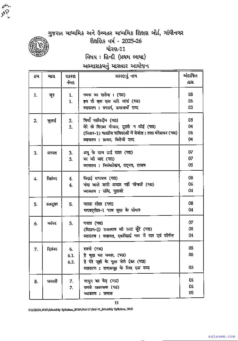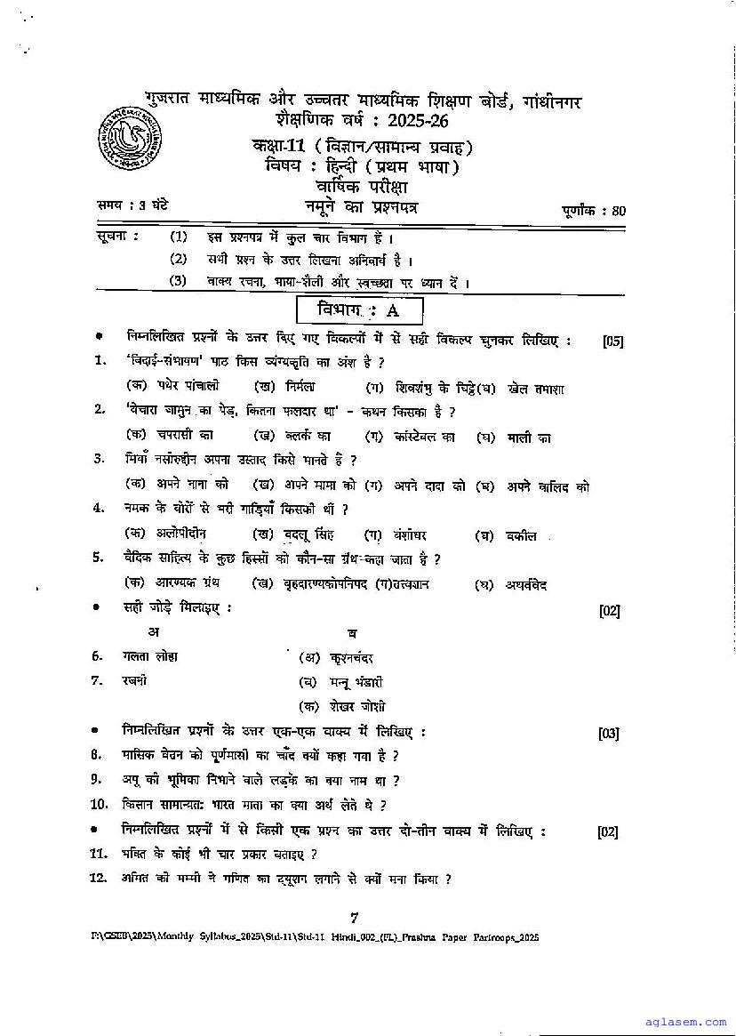 GSEB Std 11th Hindi FL Model Paper 2026 has been released by Gujarat Board. You can download the Gujarat Board Class 11 Hindi First Language Sample Paper PDF from this page on Aglasem for study purposes. This GSEB Std 11th Model Paper is for the Hindi FL subject to help you prepare for the Class 11 exams. The Hindi FL sample paper includes illustrative questions based on the latest Gujarat Board syllabus for Standard 11, thereby helping you prepare for the Hindi FL paper. By practicing with the Std 11 Hindi FL sample paper, you can aim for high marks in the GSEB exams.