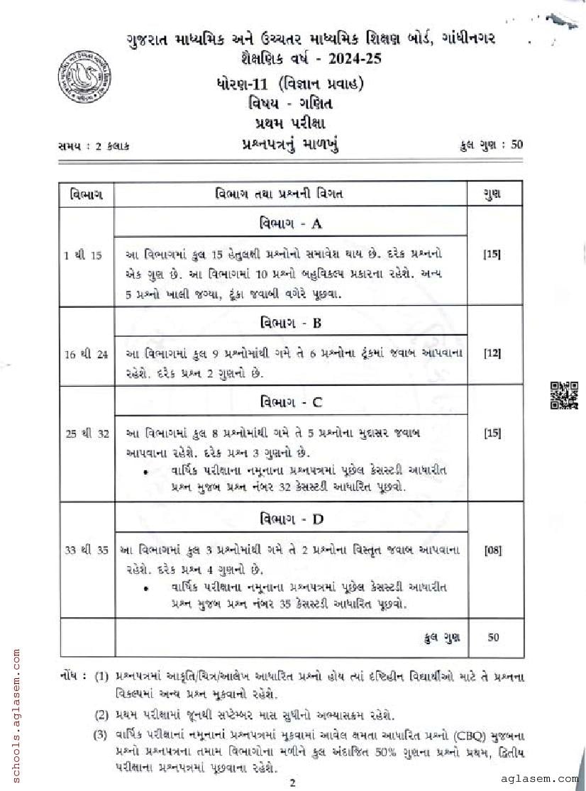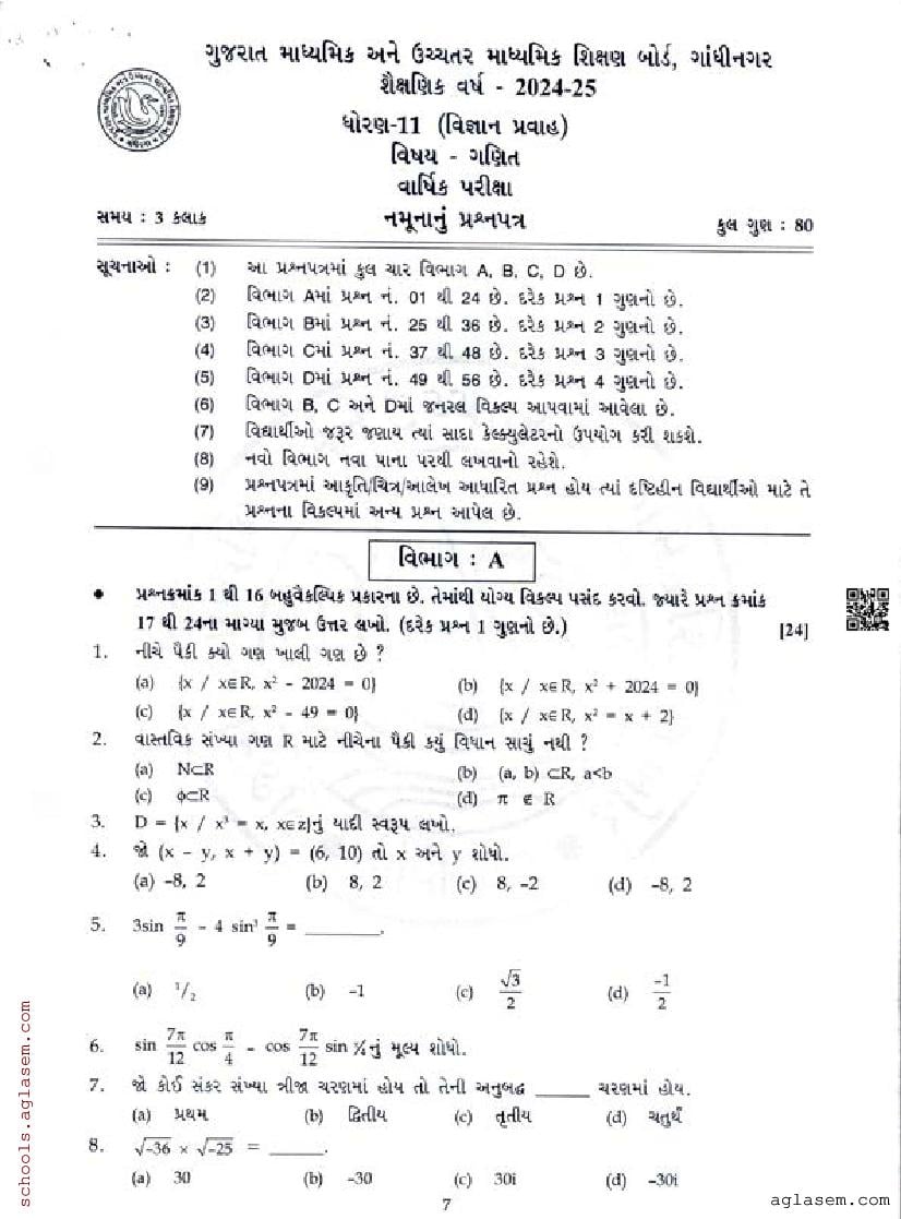 GSEB Std 11th Maths Model Paper 2026 has been released by Gujarat Board. You can download the Gujarat Board Class 11 Maths Sample Paper PDF from this page on Aglasem for study purposes. This GSEB Std 11th Model Paper is for the Maths subject to help you prepare for the Class 11 exams. The Maths sample paper includes illustrative questions based on the latest Gujarat Board syllabus for Standard 11, thereby helping you prepare for the Maths paper. By practicing with the Std 11 Maths sample paper, you can aim for high marks in the GSEB exams.
