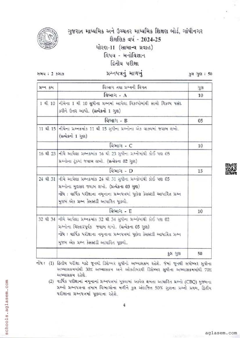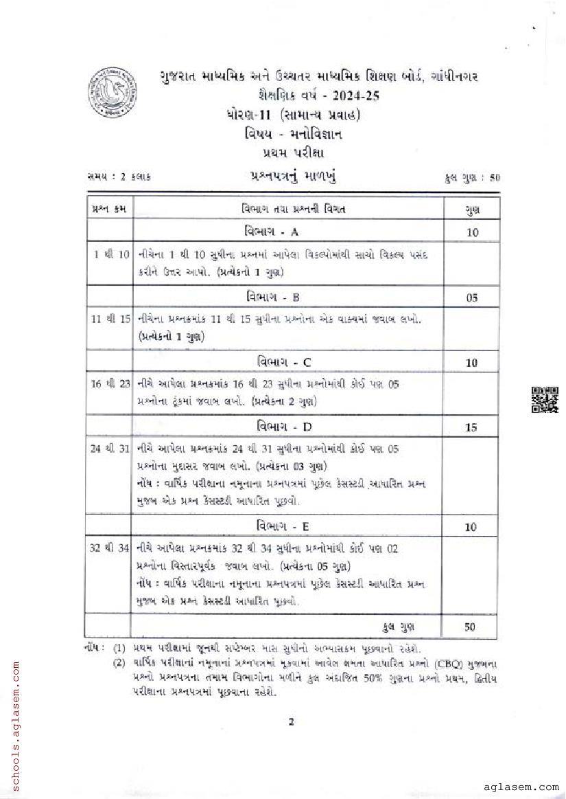 GSEB Std 11th Psychology Model Paper 2025 has been released by Gujarat Board. You can download the Gujarat Board Class 11 Psychology Sample Paper PDF from this page on Aglasem for study purposes. This GSEB Std 11th Model Paper is for the Psychology subject to help you prepare for the Class 11 exams. The Psychology sample paper includes illustrative questions based on the latest Gujarat Board syllabus for Standard 11, thereby helping you prepare for the Psychology paper. By practicing with the Std 11 Psychology sample paper, you can aim for high marks in the GSEB exams.