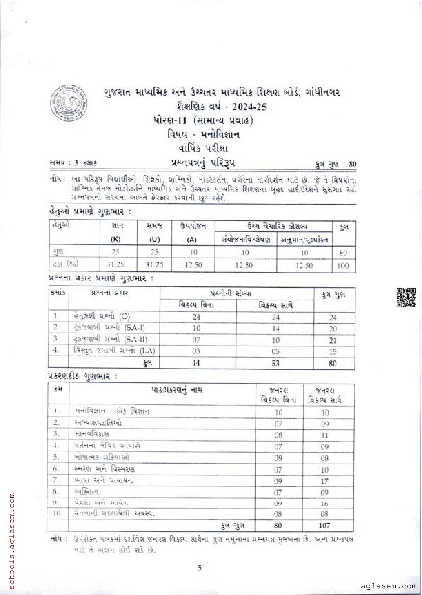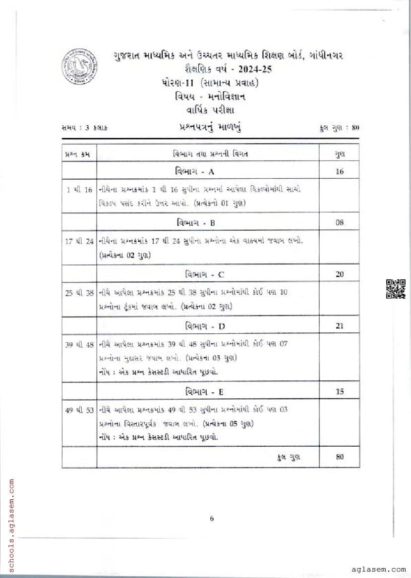 GSEB 11th Std Model Question Paper 2025 Psychology View Download