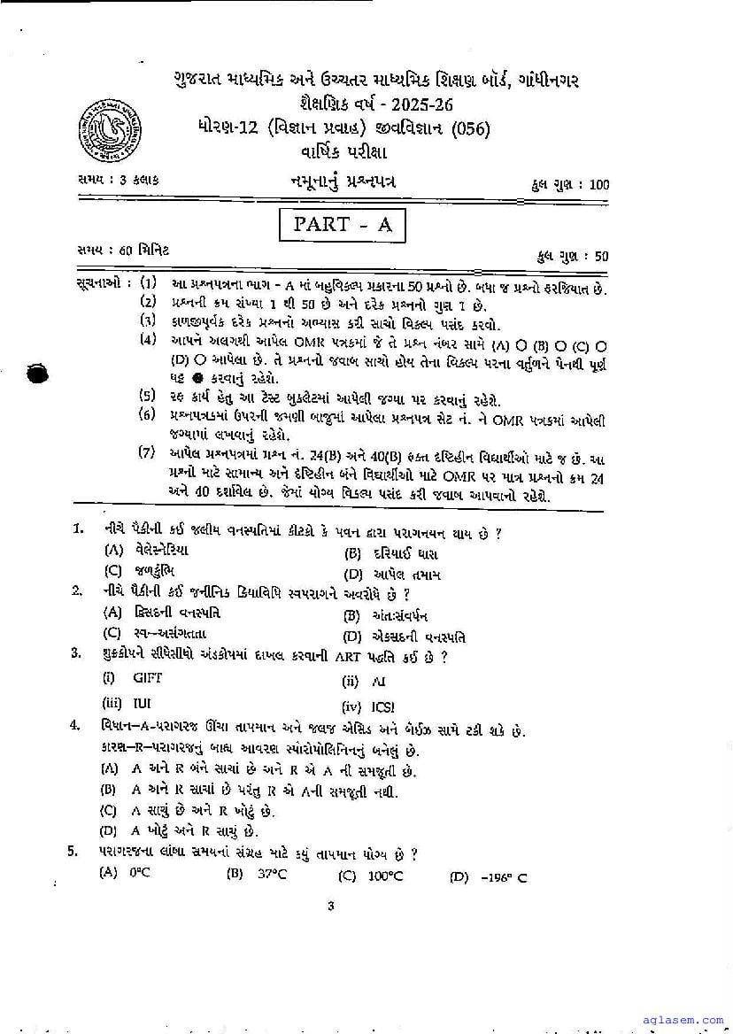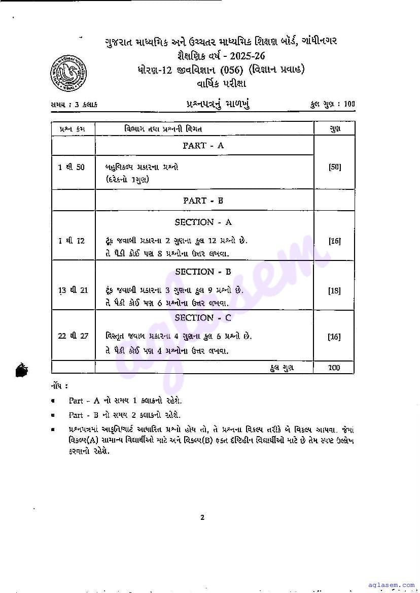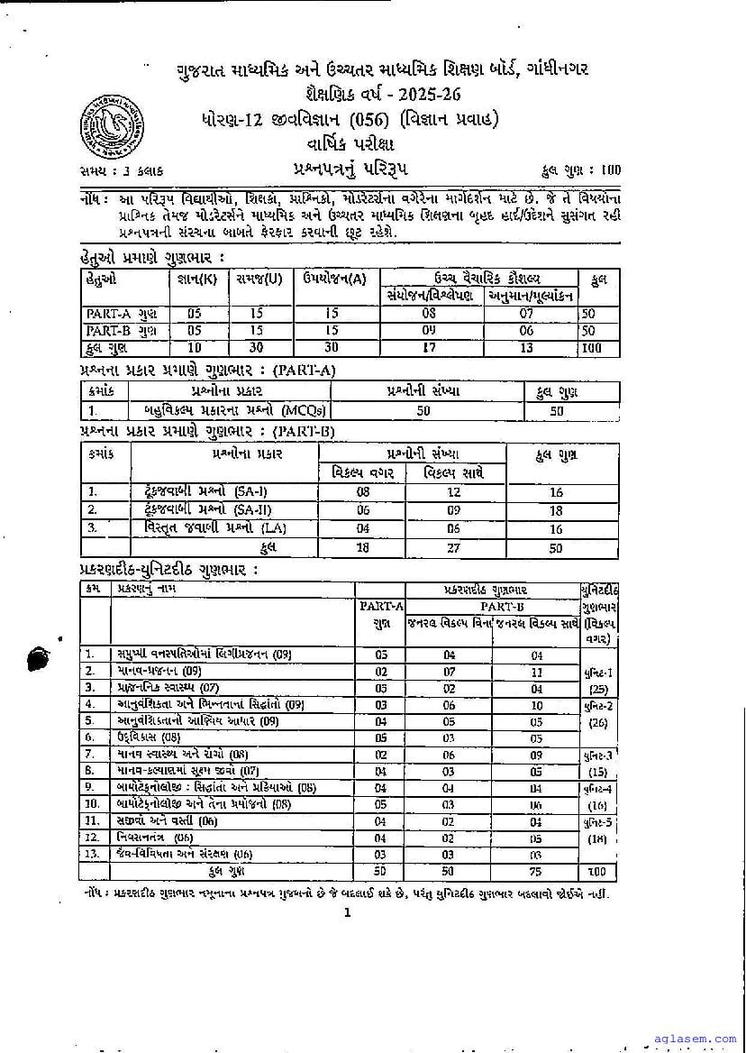 GSEB Std 12th Biology Model Paper 2026 has been released by Gujarat Board. You can download the Gujarat Board Class 12 Biology Sample Paper PDF from this page on Aglasem for study purposes. This GSEB Std 12th Model Paper is for the Biology subject to help you prepare for the Class 12 exams. The Biology sample paper includes illustrative questions based on the latest Gujarat Board syllabus for Standard 12, thereby helping you prepare for the Biology paper. By practicing with the Std 12 Biology sample paper, you can aim for high marks in the GSEB exams.