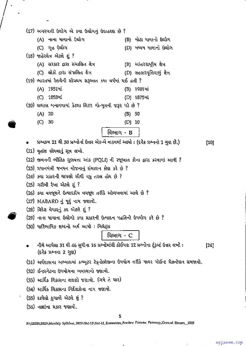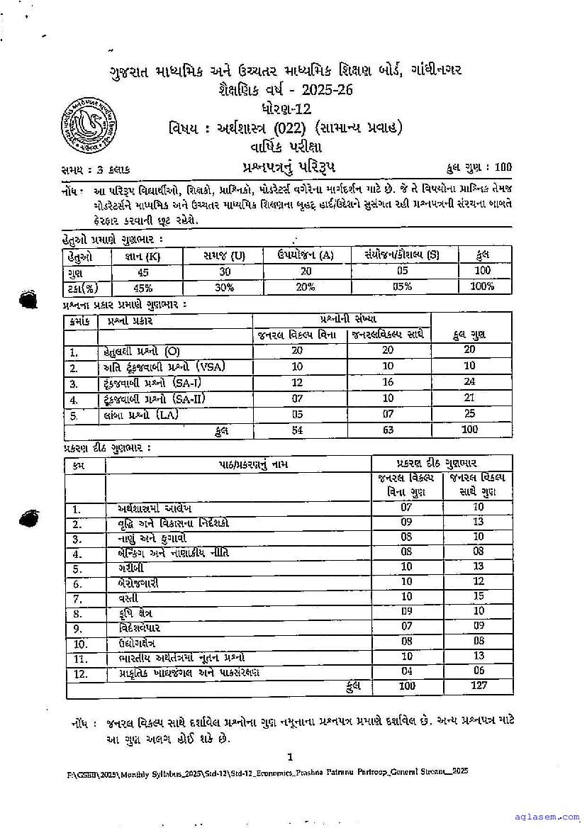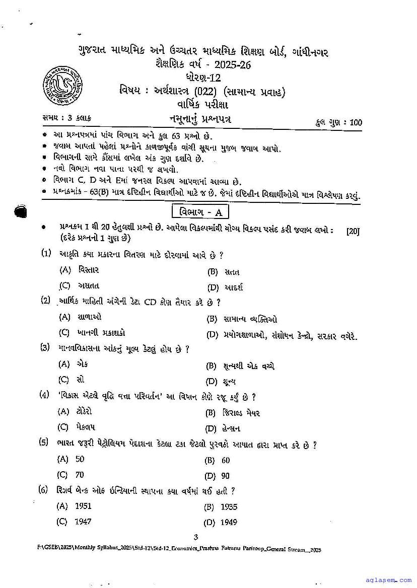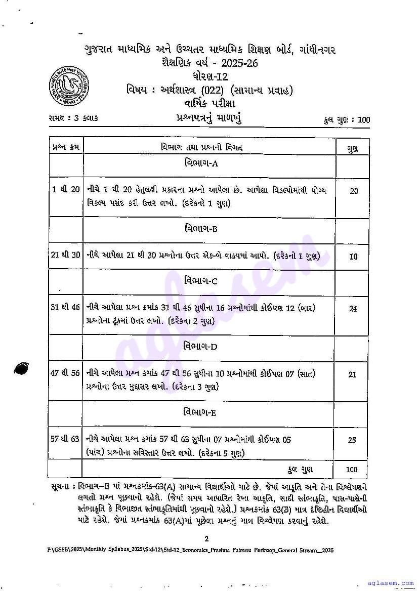 GSEB Std 12th Economics Model Paper 2026 has been released by Gujarat Board. You can download the Gujarat Board Class 12 Economics Sample Paper PDF from this page on Aglasem for study purposes. This GSEB Std 12th Model Paper is for the Economics subject to help you prepare for the Class 12 exams. The Economics sample paper includes illustrative questions based on the latest Gujarat Board syllabus for Standard 12, thereby helping you prepare for the Economics paper. By practicing with the Std 12 Economics sample paper, you can aim for high marks in the GSEB exams.