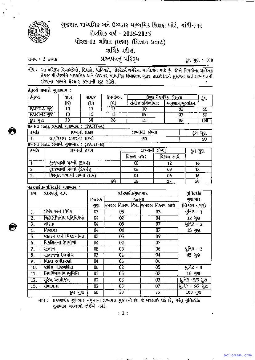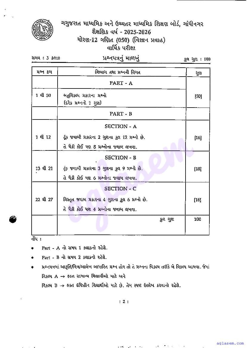 GSEB Std 12th Maths Model Paper 2026 has been released by Gujarat Board. You can download the Gujarat Board Class 12 Maths Sample Paper PDF from this page on Aglasem for study purposes. This GSEB Std 12th Model Paper is for the Maths subject to help you prepare for the Class 12 exams. The Maths sample paper includes illustrative questions based on the latest Gujarat Board syllabus for Standard 12, thereby helping you prepare for the Maths paper. By practicing with the Std 12 Maths sample paper, you can aim for high marks in the GSEB exams.