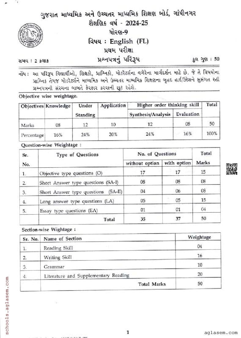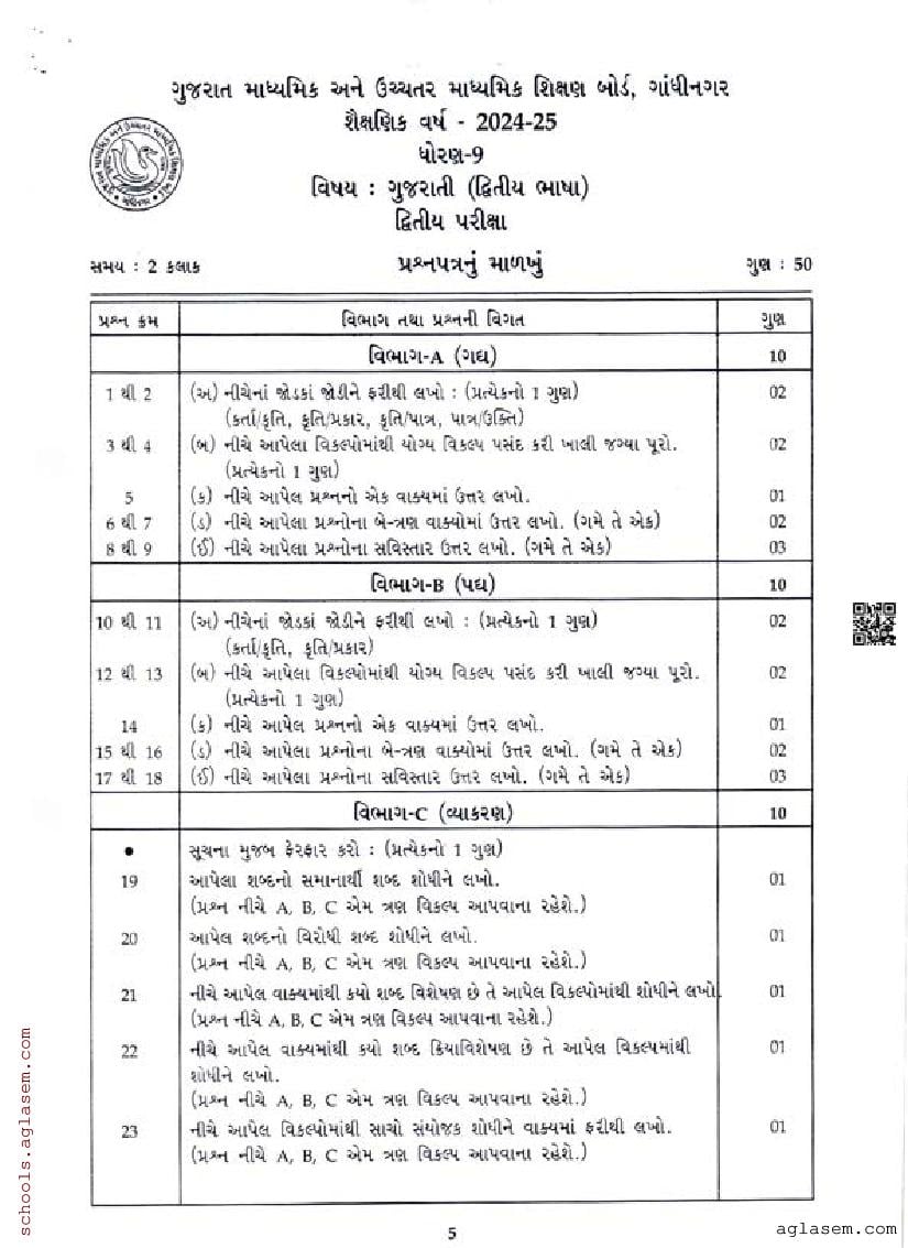 GSEB 9th Std Model Question Paper 2025 Gujarati SL View Download