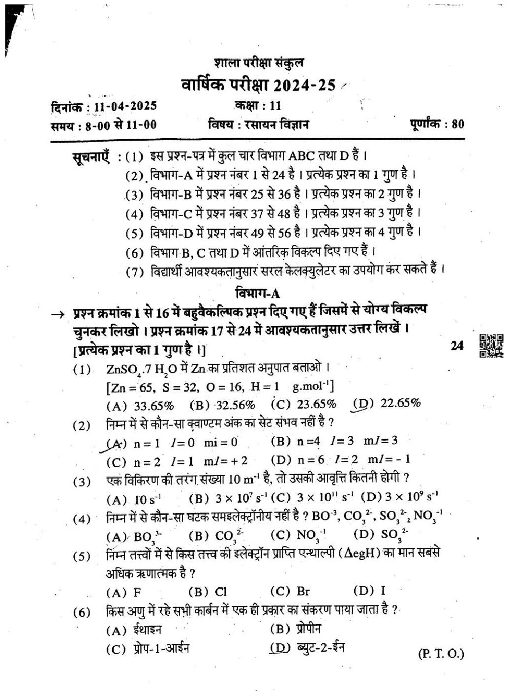 Gujarat Std 11th Chemistry Question Paper 2025 PDF