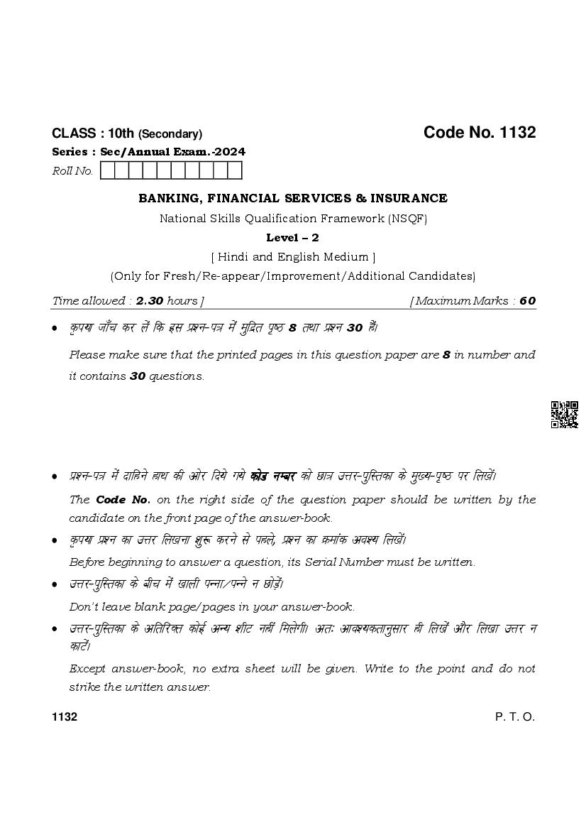 HBSE Class 10 Question Paper 2024 Banking Financial Services and Insurance View Download