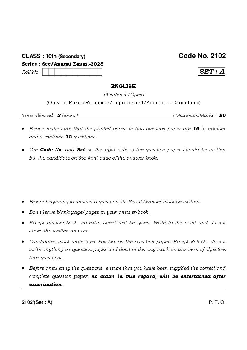 HBSE Class 10 Question Paper 2025 English View Download