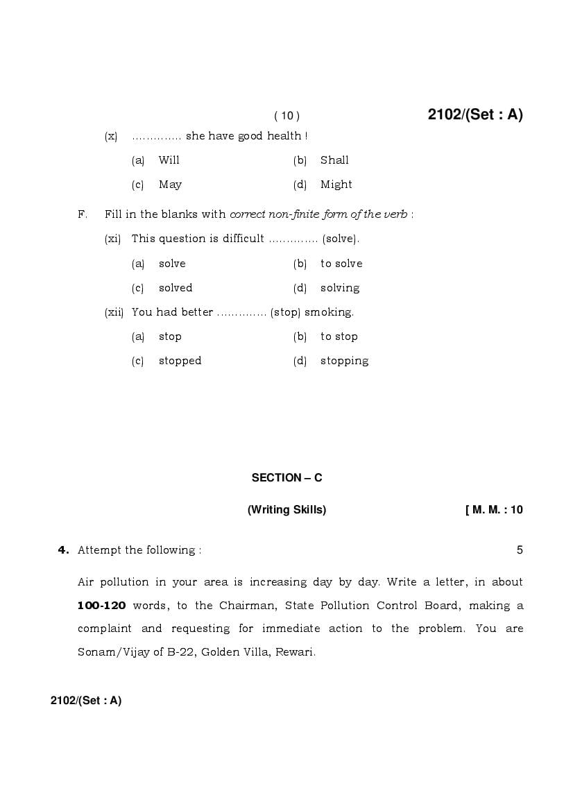 HBSE 10th English Previous Year Question Papers