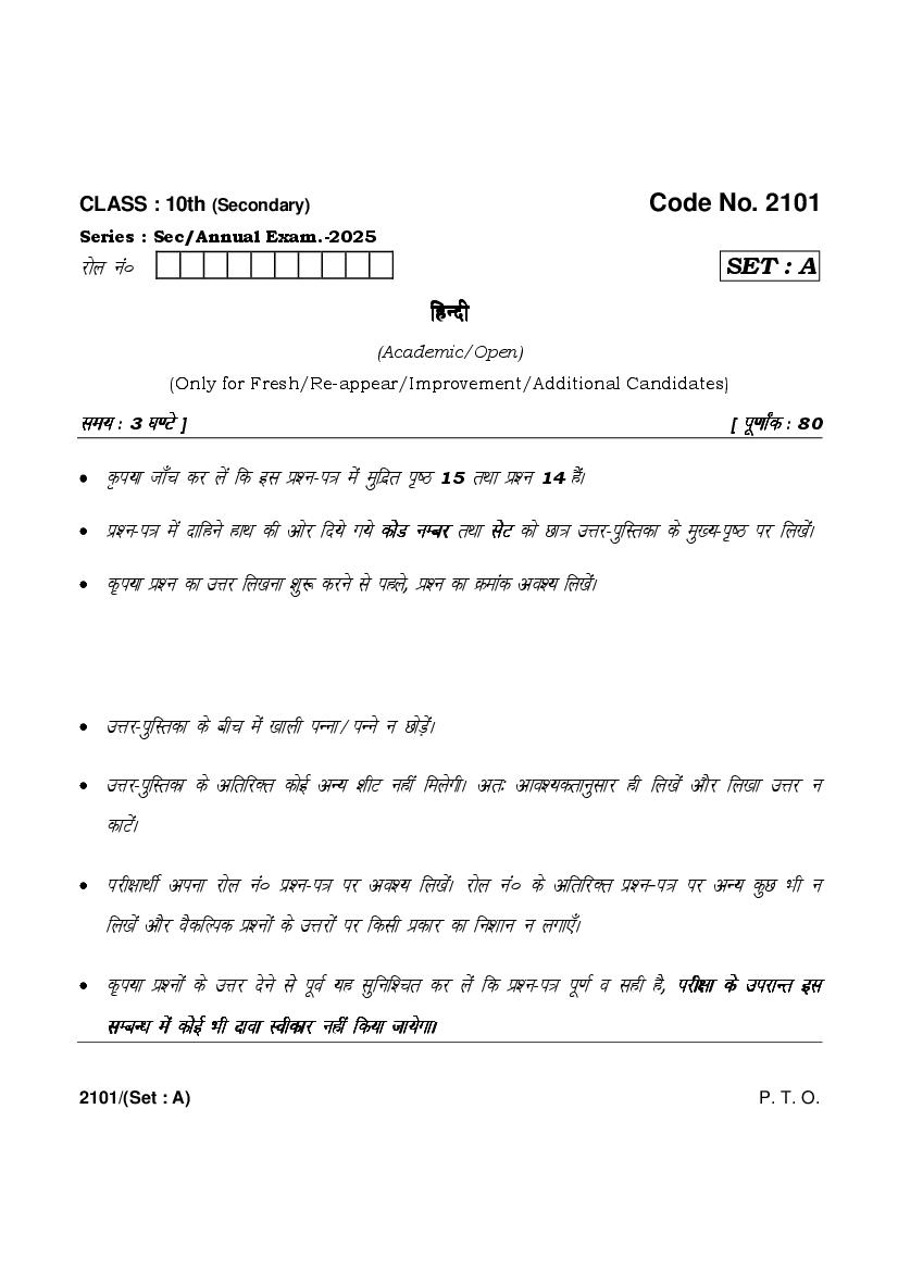 HBSE Class 10 Question Paper 2025 Hindi View Download