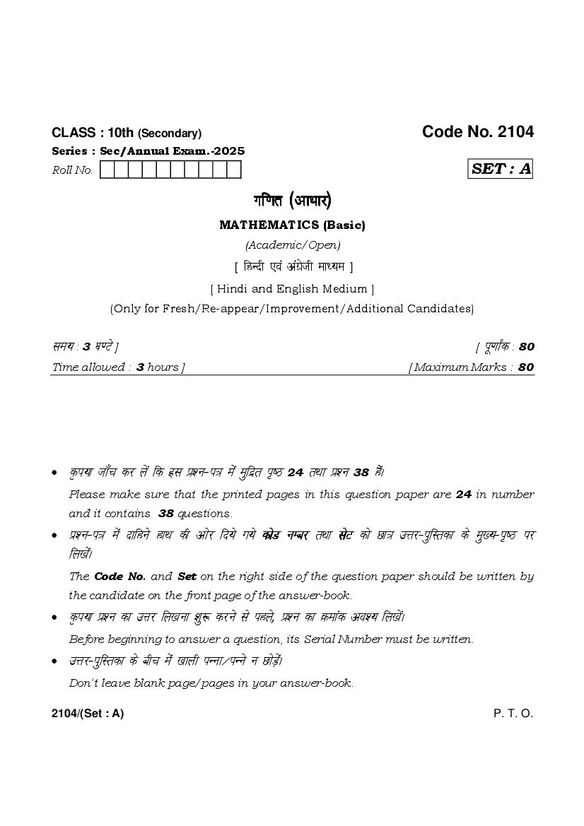 HBSE Class 10 Question Paper 2025 Math Basic View Download