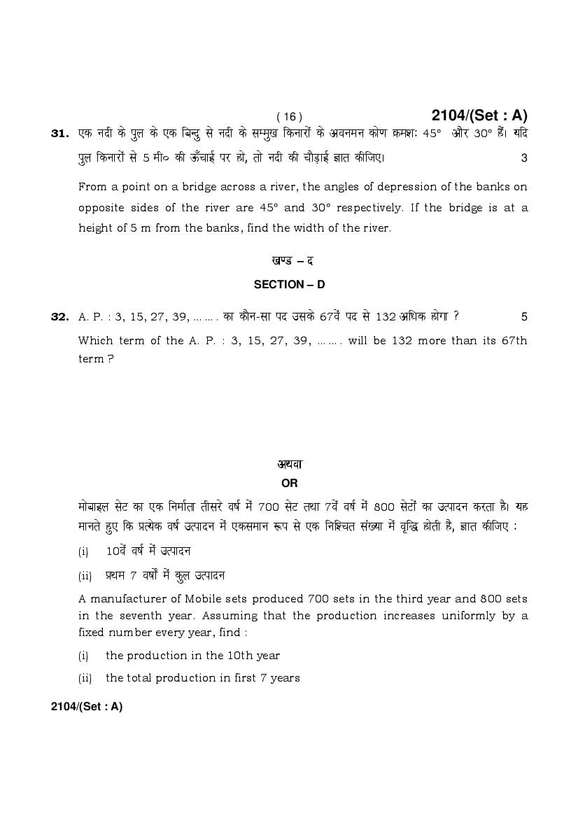 HBSE 10th Mathematics Standard Previous Year Question Papers