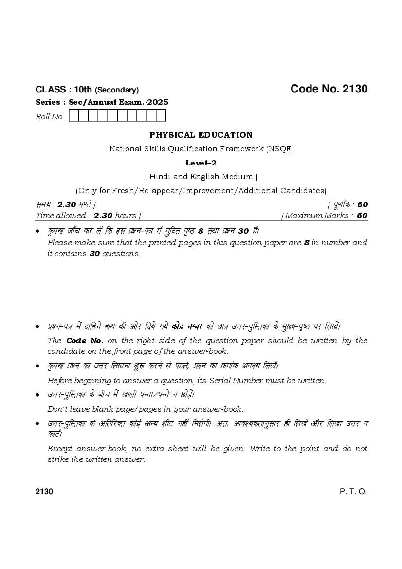 HBSE Class 10 Question Paper 2025 Physical Education View Download