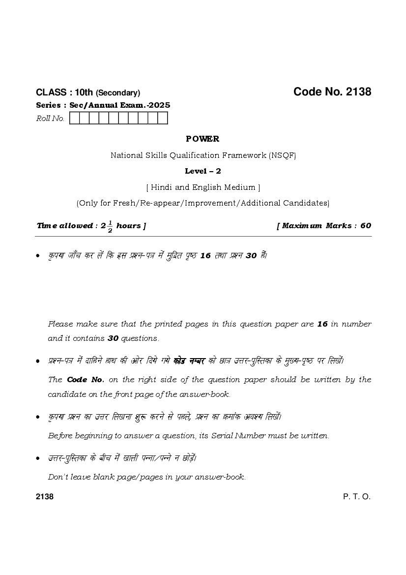 HBSE Class 10 Question Paper 2025 Power View Download