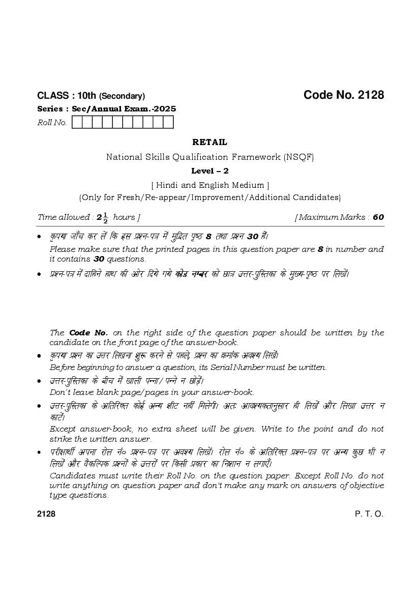 HBSE 10th Retail Question Paper 2025 – Click Here to Download Question Paper PDF