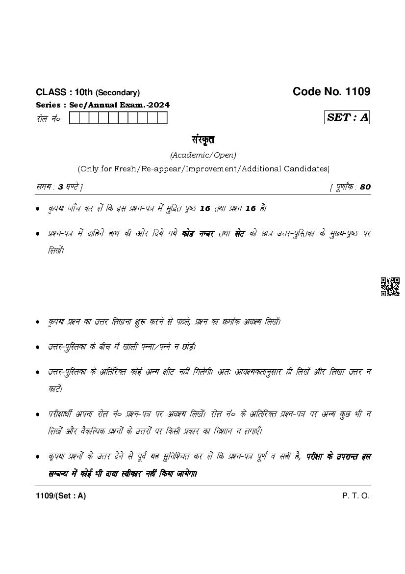 HBSE Class 10 Question Paper 2024 Sanskrit View Download