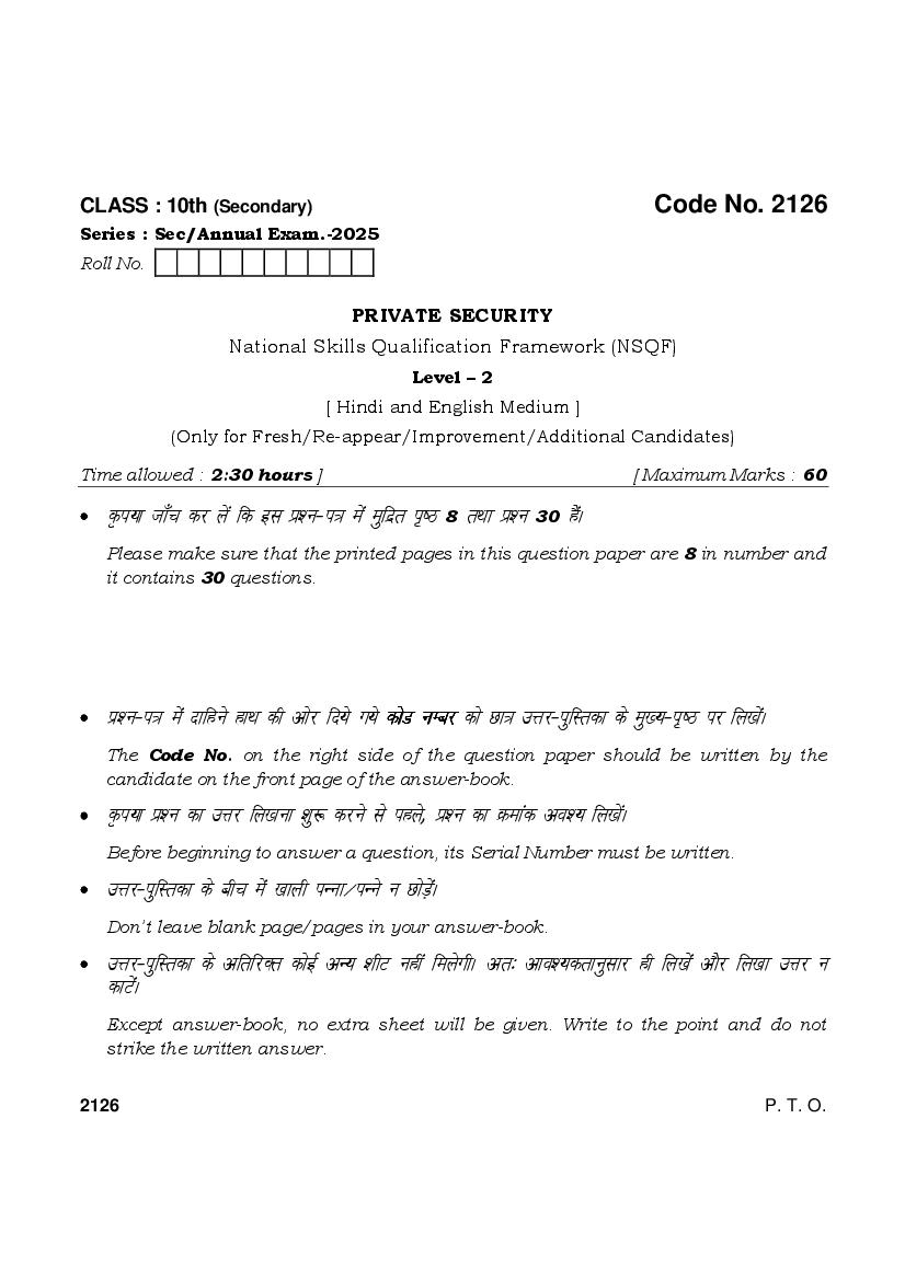 HBSE Class 10 Question Paper 2025 Private Security View Download