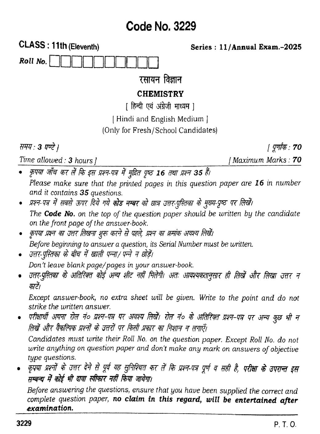 HBSE Class 11 Question Paper 2025 Chemistry View Download