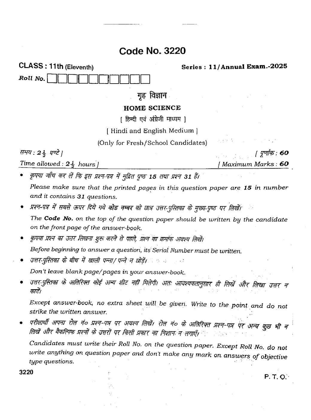 HBSE Class 11 Question Paper 2025 Home Science View Download