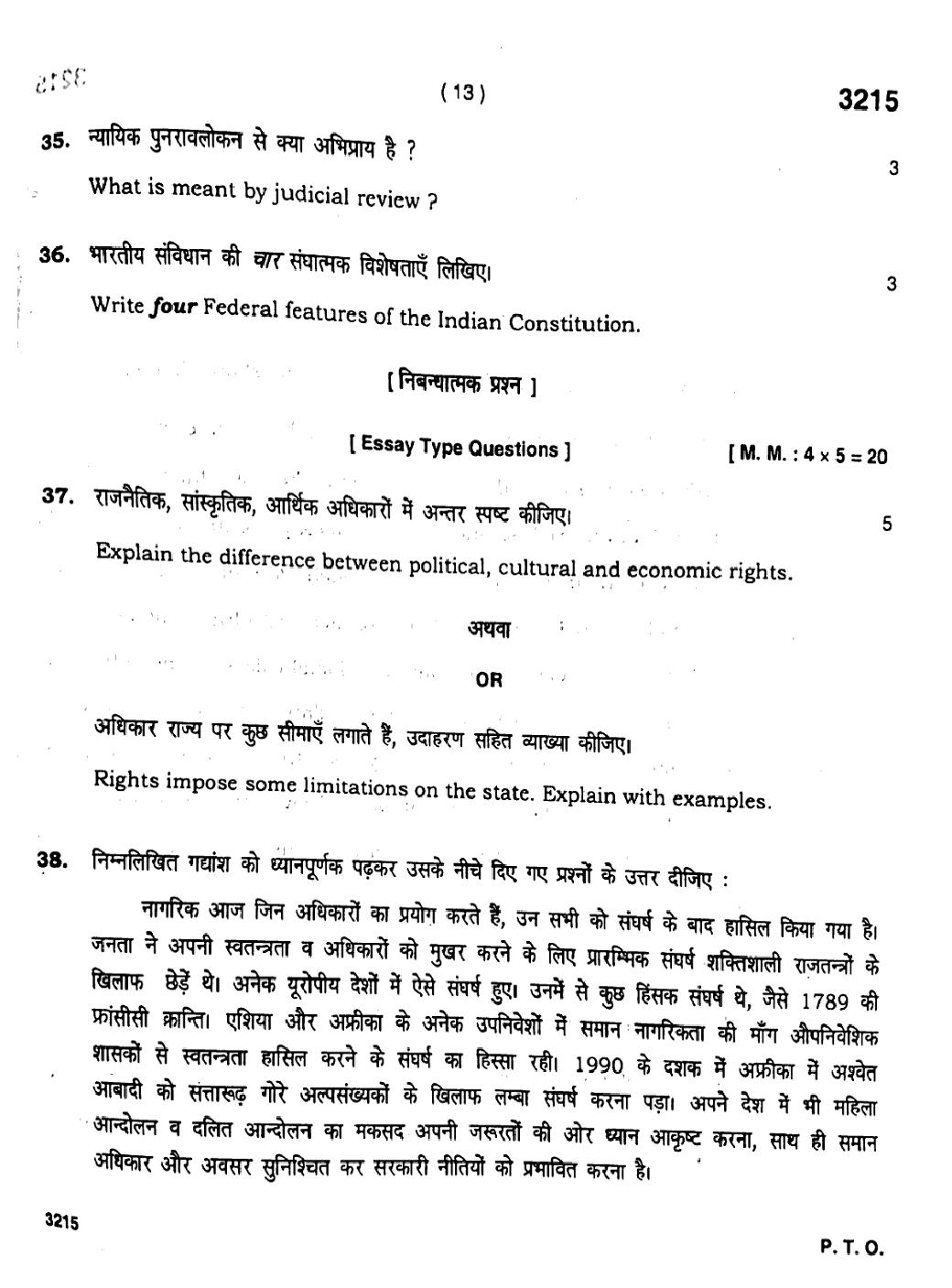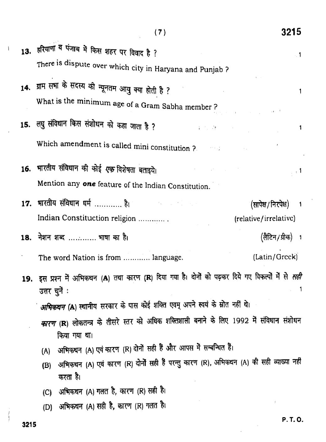 HBSE 11th Political Science Previous Year Question Paper PDF