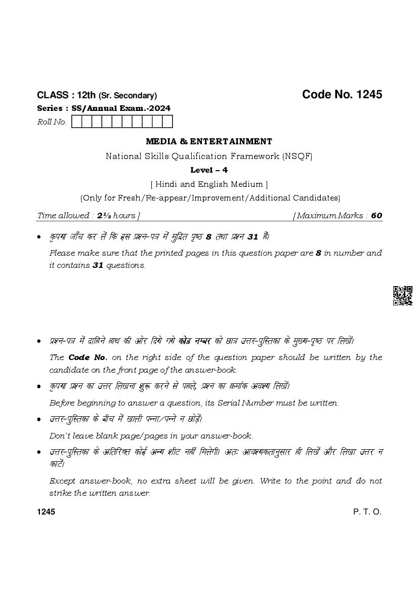 HBSE Class 12 Question Paper 2024 Media and Entertainment View Download