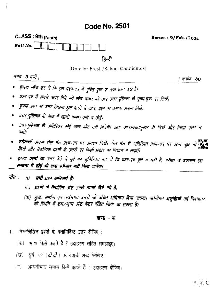 HBSE Class 9 Question Paper 2024 Hindi View Download