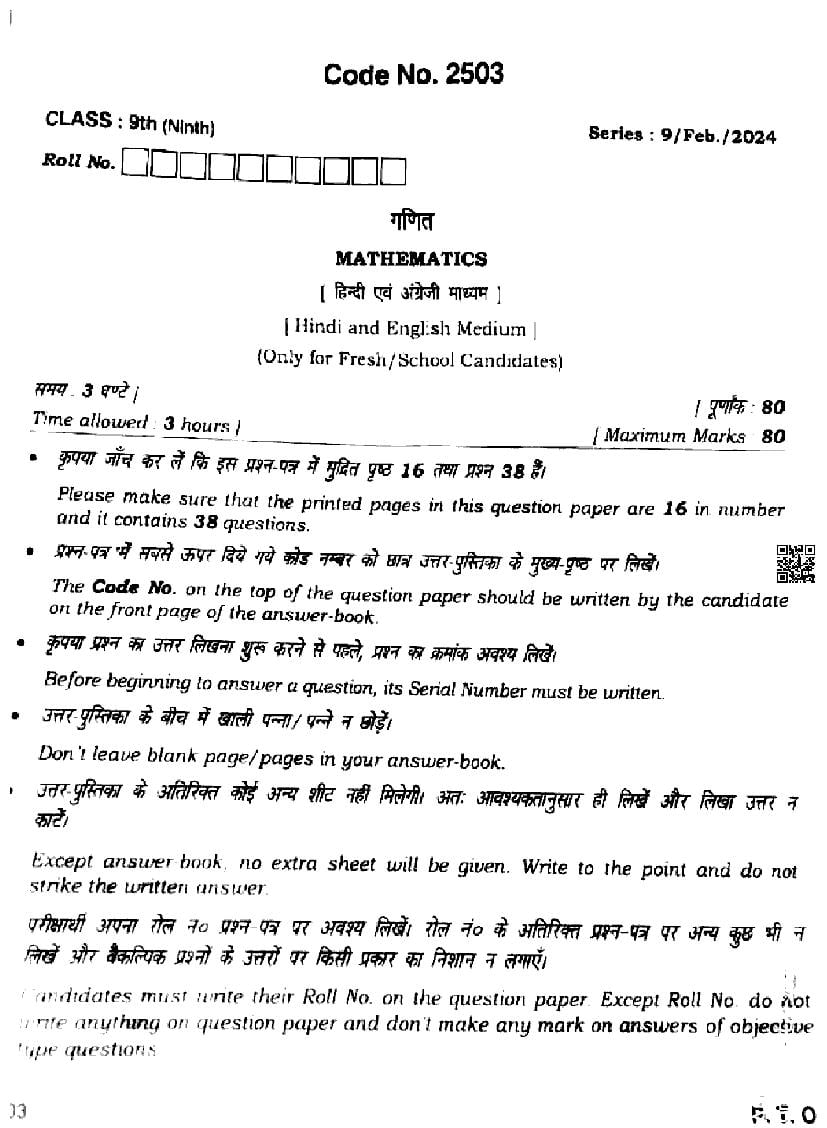 HBSE Class 9 Question Paper 2024 Maths View Download