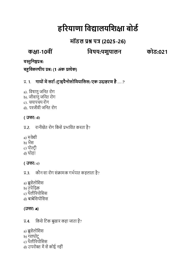 HBSE Class 10 Animal Husbandary Model Paper 2025 – Click Here to Download Model Paper PDF