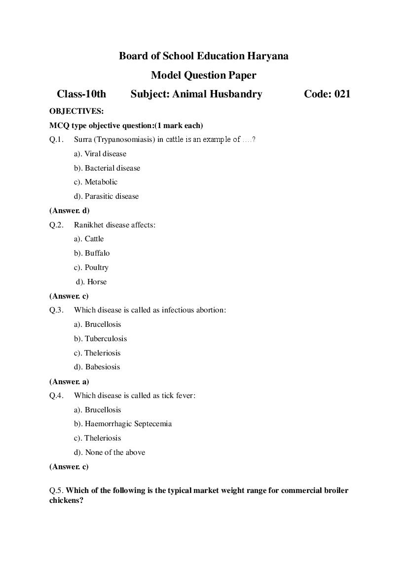 HBSE Class 10th Model Question Paper for Animal Husbandary – An Overview